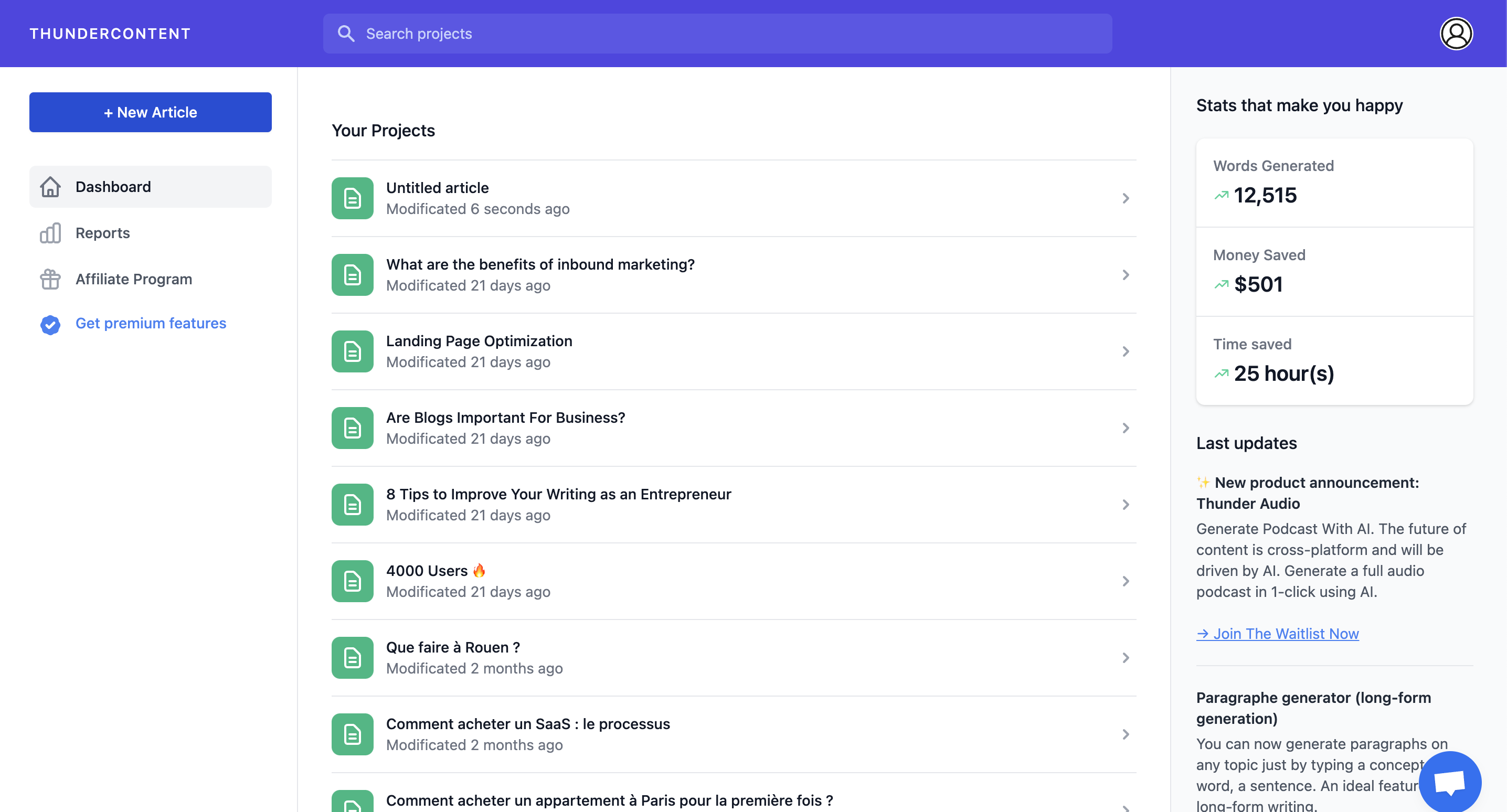 Mi piace molto ciò che genera Thundercontent. Ho provato alcuni AI e alcuni di essi generano molto contenuto, ma spesso fuori tema o con frasi che non hanno davvero senso. Soprattutto per contenuti tecnici. Recensione raccolta e ospitata su G2.com.