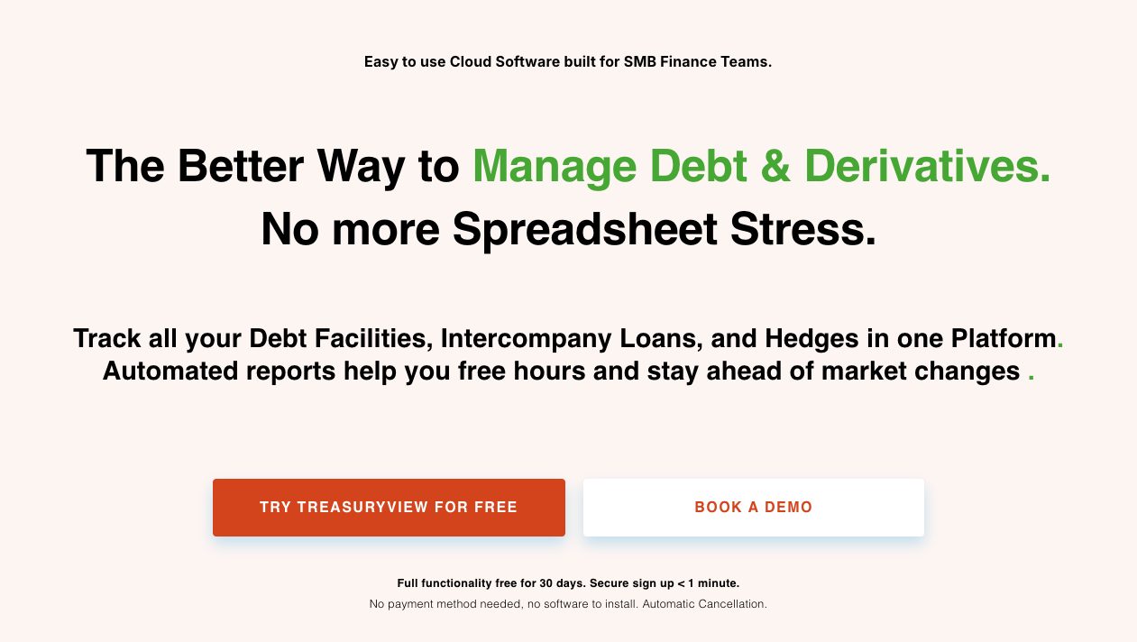 TreasuryView aiuta i team finanziari a risparmiare tempo, minimizzare gli errori e prendere decisioni migliori su finanziamenti e rischi fin dal primo giorno. È un'alternativa pratica ai sistemi complessi e un sostituto affidabile per i fogli di calcolo. Colmiamo il divario di automazione dove il TMS tradizionale è eccessivo e i fogli di calcolo statici sono una responsabilità.