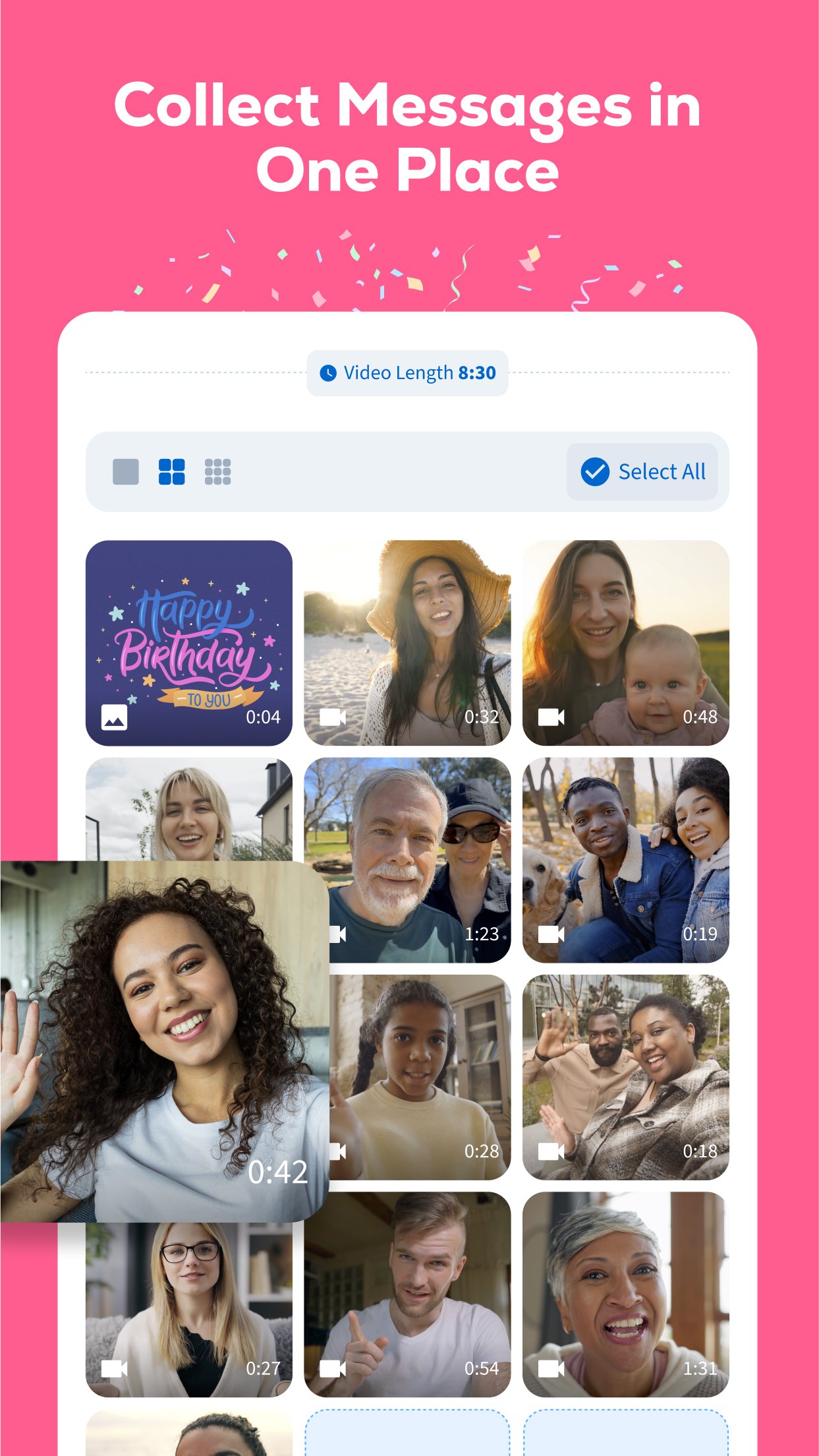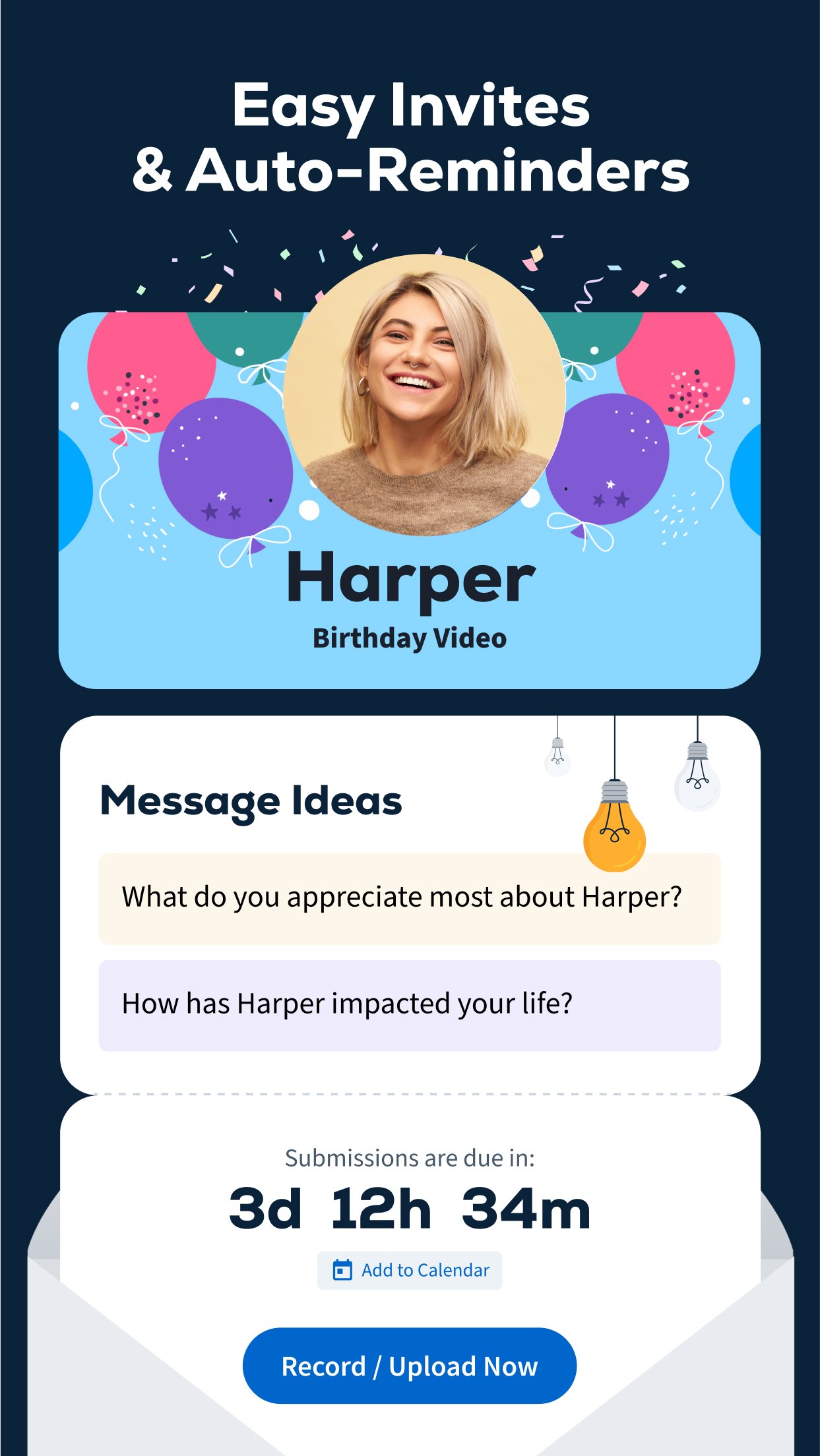 VidDay include un editor guidato che consente agli organizzatori di disporre le clip, applicare temi, aggiungere schede di testo, didascalie, foto e musica di sottofondo, e visualizzare in anteprima il video finale prima della pubblicazione. Miglioramenti integrati come i promemoria automatici aiutano ad aumentare i tassi di partecipazione, mentre l'upscaling delle foto potenziato dall'IA migliora la chiarezza delle immagini a bassa risoluzione inviate dai contributori. Per gli utenti che preferiscono un'assistenza aggiuntiva, VidDay offre un servizio opzionale di Editing White Glove (editing fatto per te) in cui un team di editing umano gestisce i promemoria, assembla il video e prepara la versione finale per la condivisione.