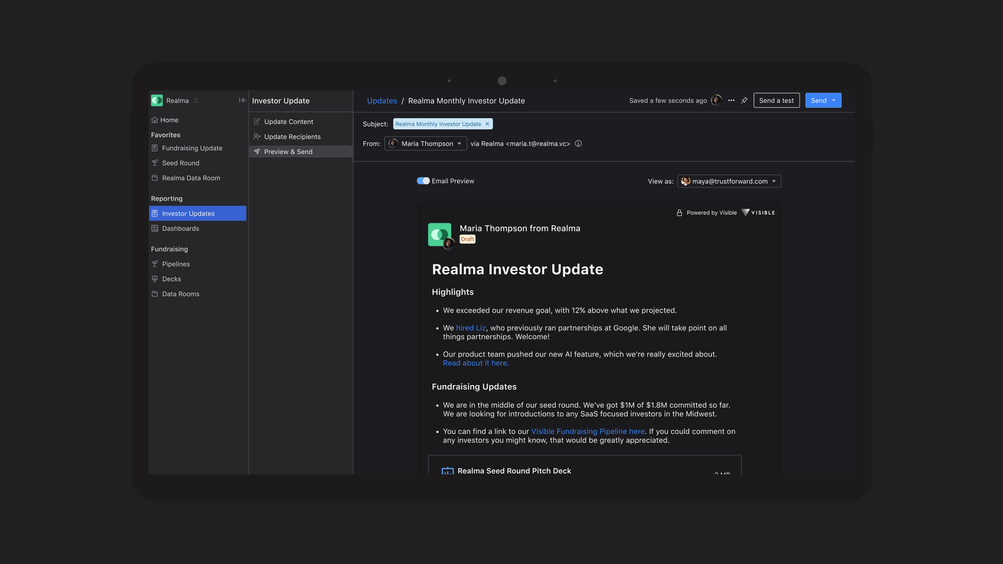 Visible è un ottimo strumento da utilizzare per monitorare le metriche finanziarie e renderle facilmente condivisibili e visualizzabili in tempo reale. Questo è solo un assaggio di come Visible può essere utilizzato. Sono entusiasta di esplorare ulteriormente il prodotto. Se il prodotto non fosse abbastanza buono, Mike e il resto del team non potrebbero essere più di supporto e aperti ai feedback. Sono persone fantastiche da avere al tuo fianco per portare la tua reportistica finanziaria al livello successivo. Recensione raccolta e ospitata su G2.com.