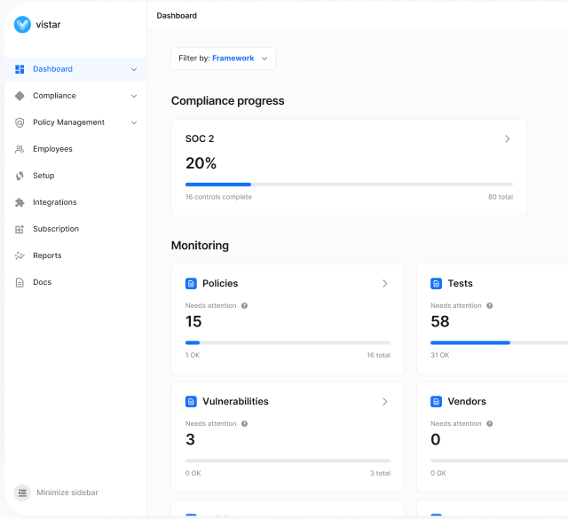 Secureframe aiuta le aziende a prepararsi per l'impresa semplificando la conformità a SOC 2 e ISO 27001. Secureframe consente alle aziende di ottenere la conformità in poche settimane, anziché mesi, e monitora oltre 40 servizi, inclusi AWS, GCP e Azure.