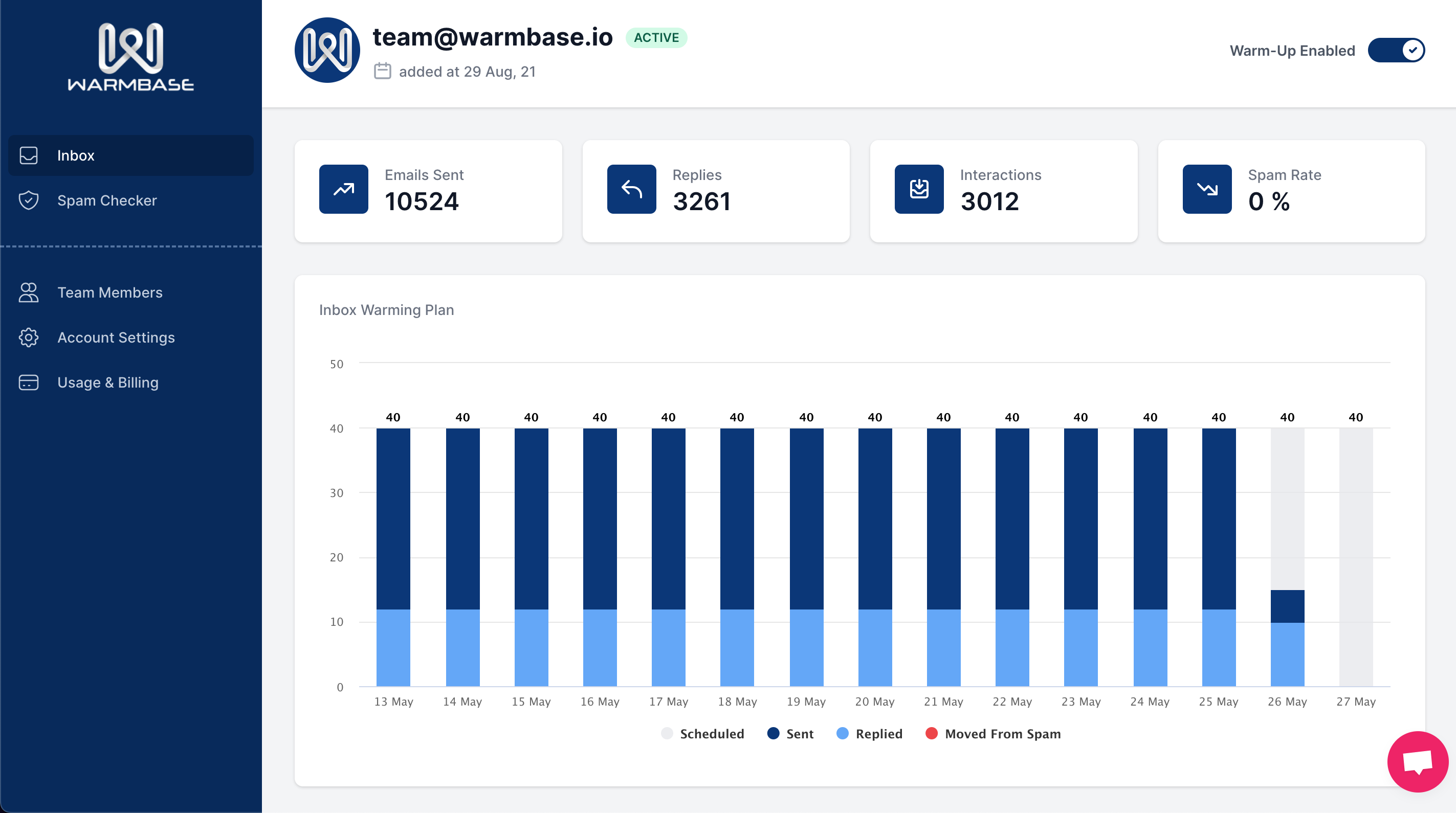 Avevo problemi con le email che finivano nella cartella spam. Ho iniziato a usare Warmabse e nel giro di un mese ho ottenuto ottimi risultati e risposte. Ora la mia reputazione email è migliore che mai! Recensione raccolta e ospitata su G2.com.