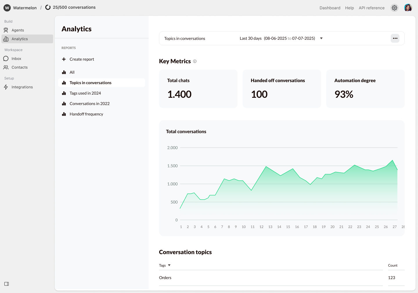 Penso che l'IA sia fantastica e ciò che l'IA può fare è sorprendente. Penso che vogliamo accelerare ora poiché l'IA e Watermelon sono ancora in fase di sviluppo. A volte il nostro agente è lento prima di fornire una risposta. Quando raccoglie nuove informazioni sul sito web, ci vuole tempo. E quanto più lavoro con l'agente, tanto più desidero avere alcuni approfondimenti extra per rivedere tutte le chat. Sarebbe fantastico se le 'vecchie conversazioni' potessero essere visibili nell'interfaccia invece che in un file csv. Anche i sottotag sarebbero fantastici per il futuro. Ma so anche che i tag sono stati appena lanciati il 14 agosto. Quindi, in questo caso, stiamo tutti sviluppando. Recensione raccolta e ospitata su G2.com.