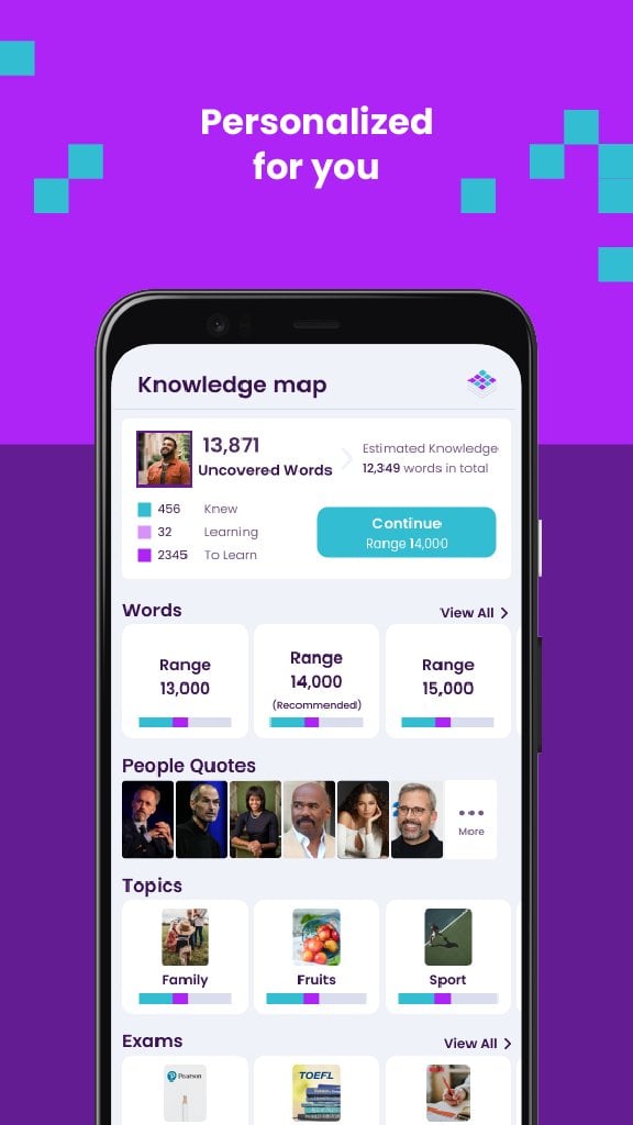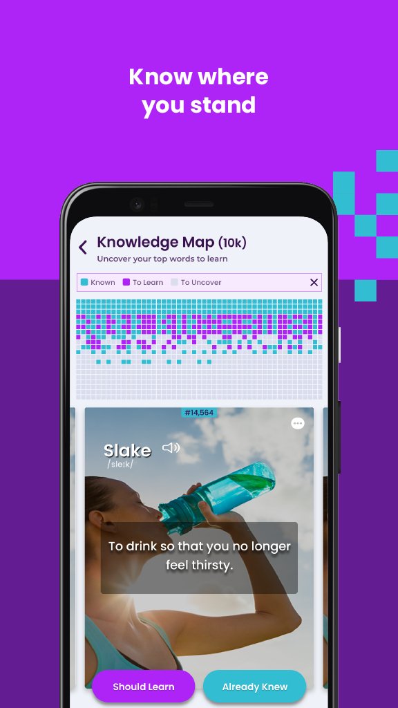 Creando la tua Mappa della Conoscenza in WordUp, scopri costantemente la prossima parola più preziosa da imparare che ancora non conosci e ti concentri sull'impararle in quell'ordine. È il modo più intelligente per trascorrere il tuo tempo imparando!