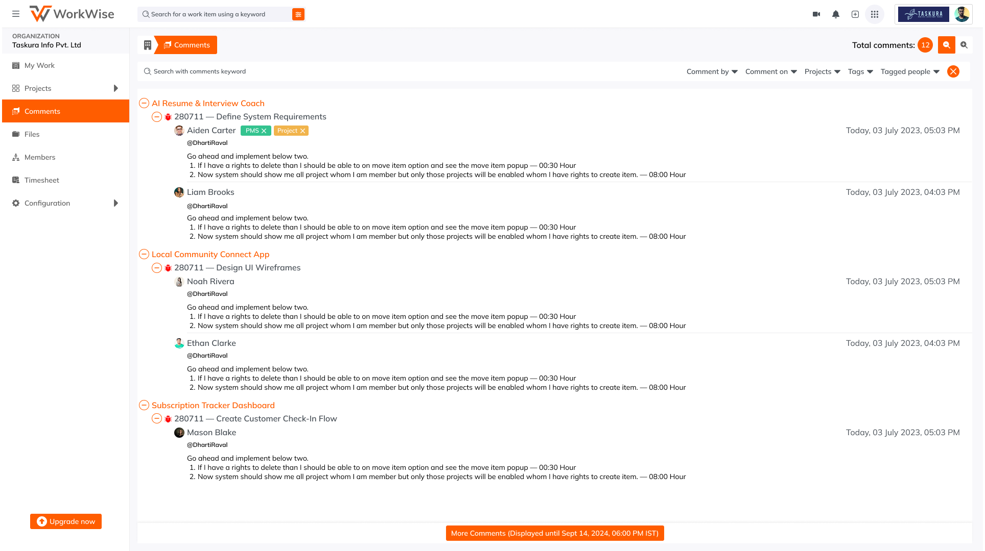 La piattaforma supporta la collaborazione in tempo reale del team attraverso commenti, condivisione di file e notifiche intelligenti, eliminando la necessità di comunicazioni disperse. WorkWise offre anche un modulo Timesheet integrato per registrare le ore di lavoro, monitorare la produttività e semplificare le approvazioni.