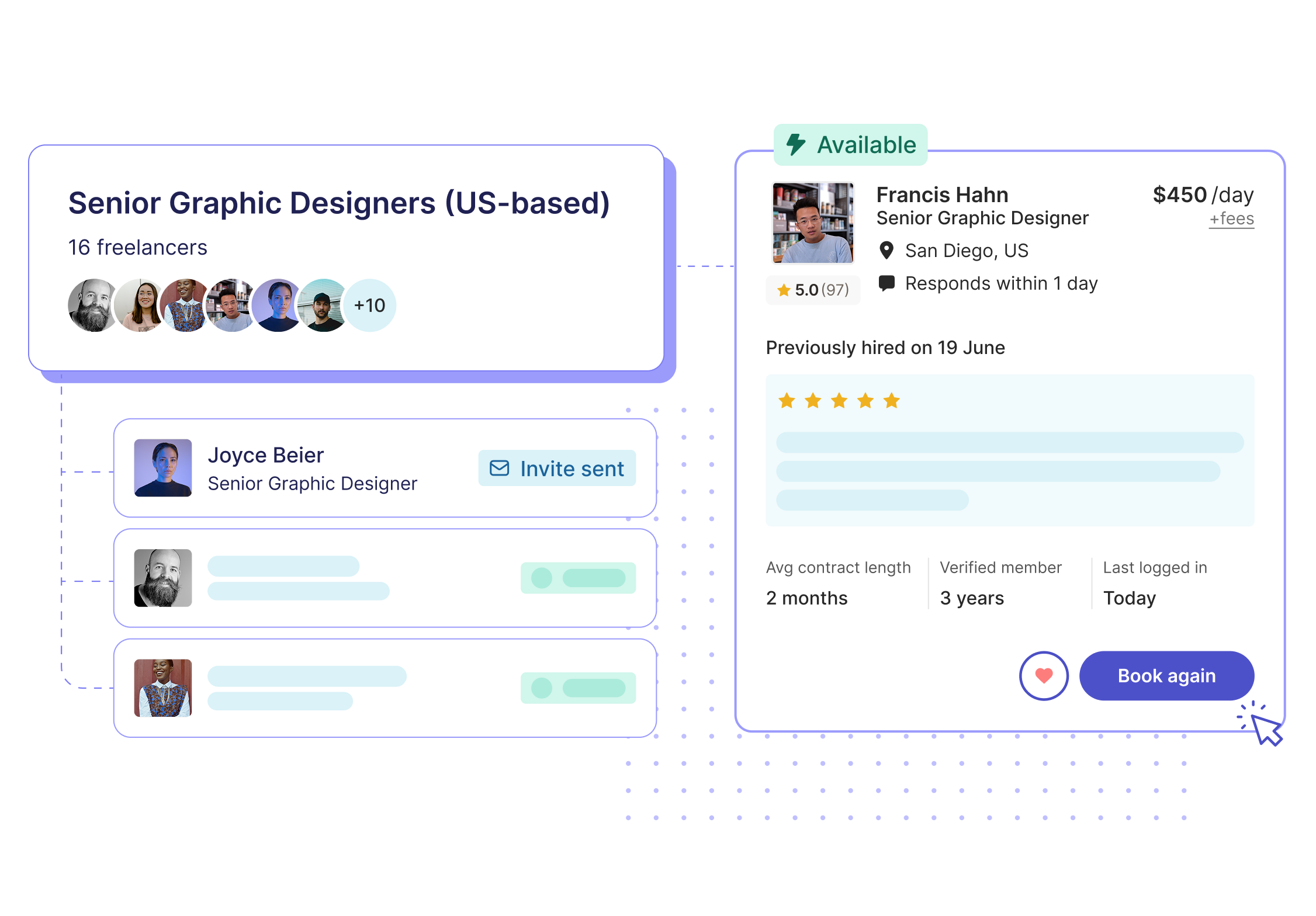 Il personale di solito risponde rapidamente e cercherà di risolvere qualsiasi problema io abbia. Il marketplace offre molti freelance, molto utile quando si ha bisogno di risorse extra, e la sezione di creazione del brief della piattaforma è facile da usare. Devo integrare nuovi freelance regolarmente ed è un processo semplice, anche se potrebbe essere necessario attendere un po' per il completamento dei controlli di sicurezza.