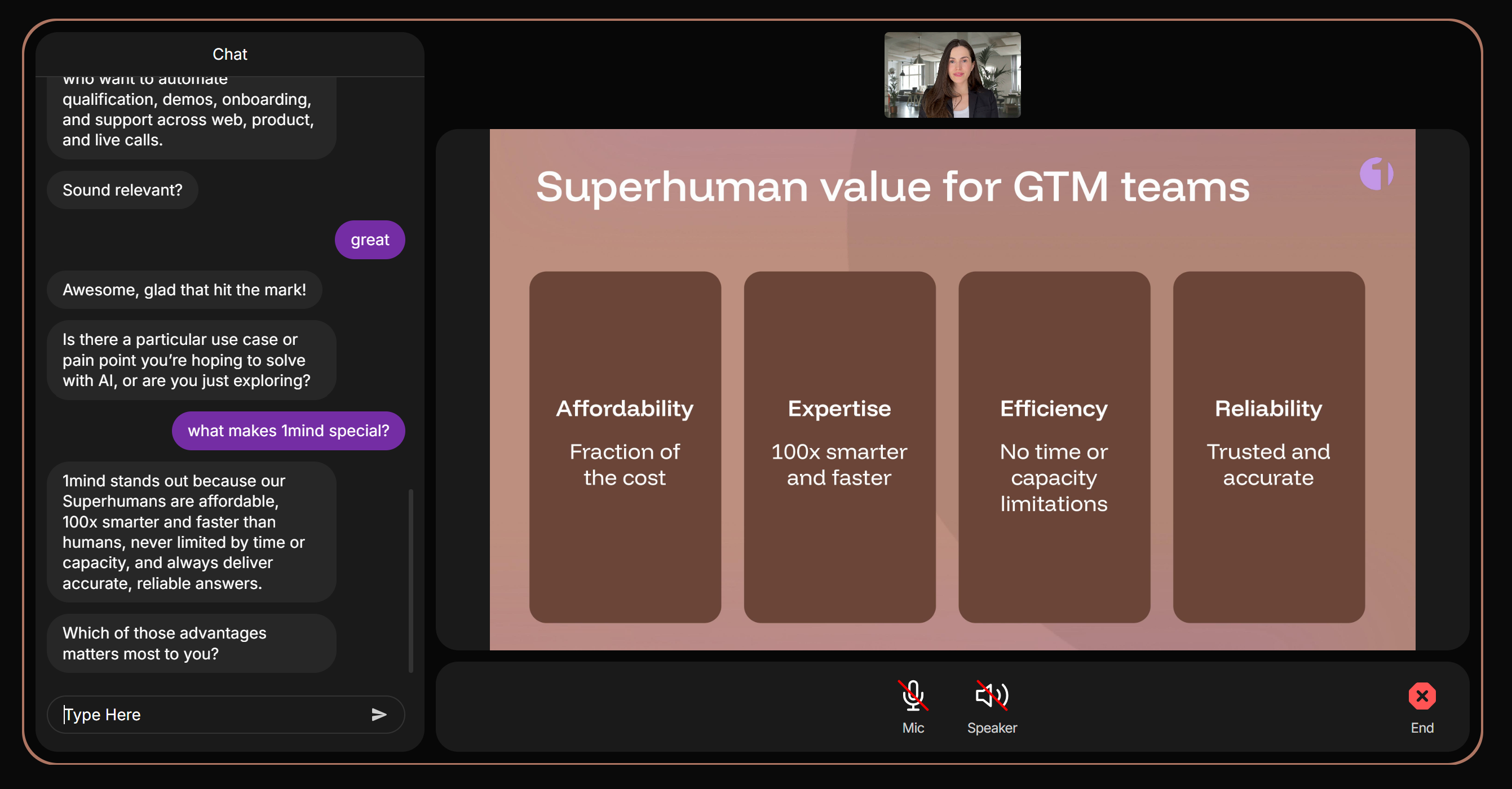 1mind matches prospect with the right solutions, examples, and resources that fit their situation (whether it’s a question from a prospect or a general chat). It can share all kinds of helpful content within the conversation: testimonial videos, documents, and even the correct sales rep's calendar. It's trained off our best sales conversations (we exported the discovery call transcripts that led to Closed Won deals) and effectively acts as a 24/7 rep on our website. It feels like a real experience talking to a rep vs using a chat tool. Review collected by and hosted on G2.com.