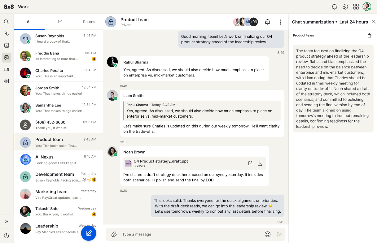 AI-Driven Meetings & Messaging: Host secure video meetings with smart summaries, live transcription, and integrated chat.