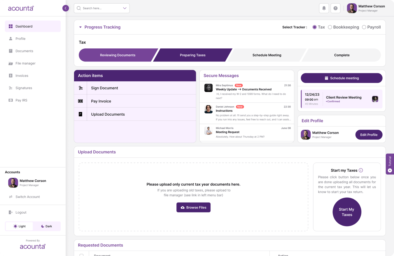 1. **Client Management**: Systems for managing client relationships, tracking interactions, and storing client data. This includes CRM (Customer Relationship Management) features specific to accounting firms, helping to maintain strong client relationships and provide timely services.