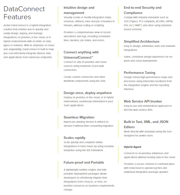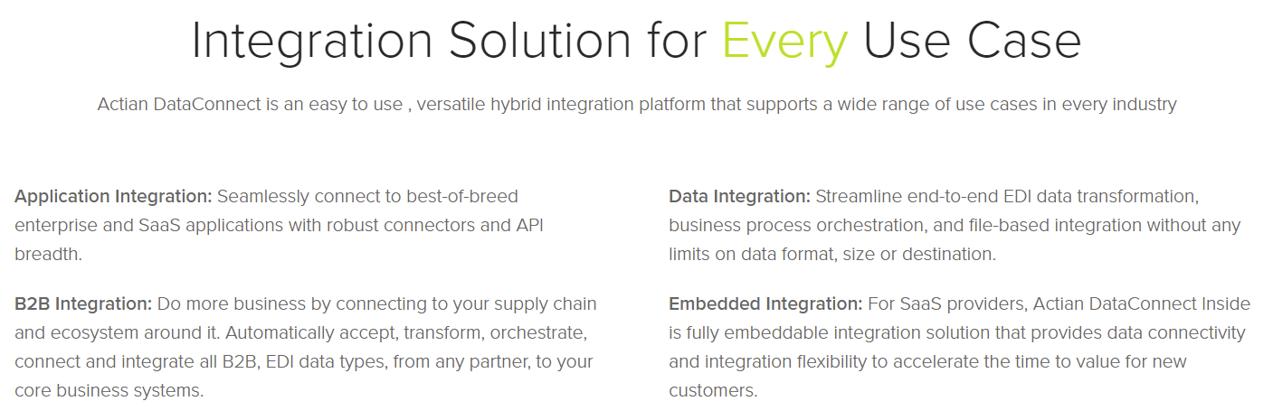 The flexibility that the solution allows when mapping, moving, and transforming data. Using the data integrator, it was very easy to program for all sorts of incoming data and handle all types of situations based on events, data quality, variables, etc. Review collected by and hosted on G2.com.