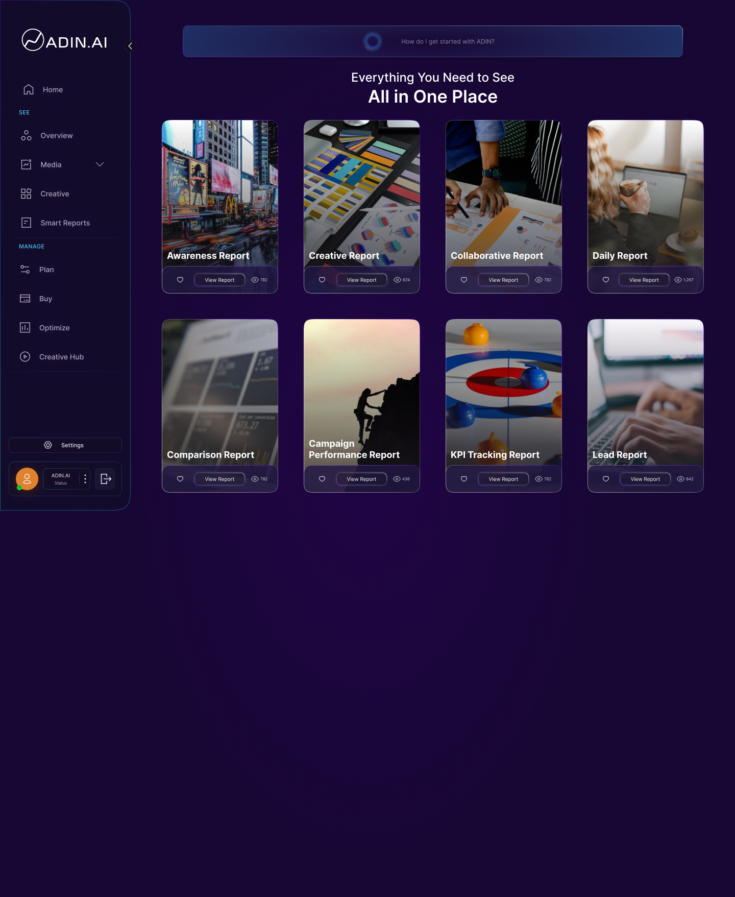 - Advertisers can access ADIN.AI’s pre-built templates for Awareness, Creative, and KPI Tracking, or request fully customized reports tailored to their brand’s specific needs.