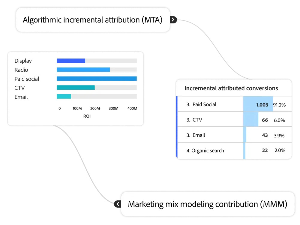 - Unified marketing measurement - Unify ROI measurement and planning across channels—whether online or offline – by connecting and integrating summary- and touchpoint-level data analysis in a user-friendly application. Using our patent-pending, bi-directional transfer learning technology that integrates multi-touch attribution (MTA) and marketing mix modeling (MMM) methodologies, unlock consistent, comprehensive measurement insights.