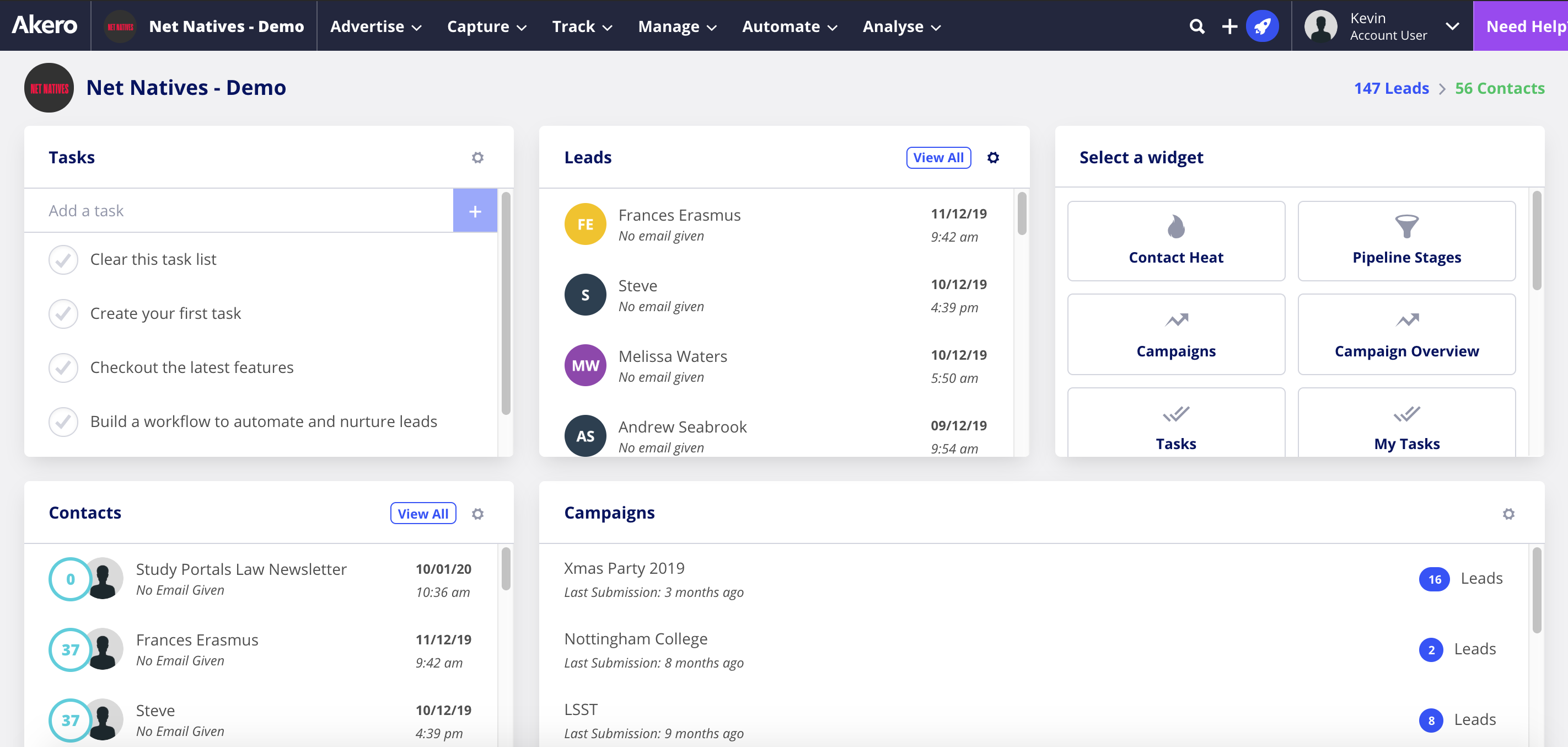 Akero Demo - Dashboard home page