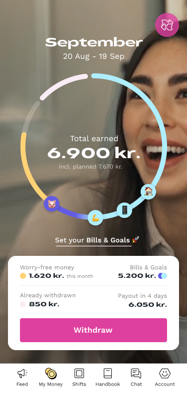 We've made bills fun (almost!). Okay okay, not fun - but we've removed the headache. Your employees get an easy overview of expected pay, budgeting tools, and freedom to get paid for a shift as soon as it is completed. Educate your employees on how to budget: in the app they can set up bills & savings goals and keep track of them.