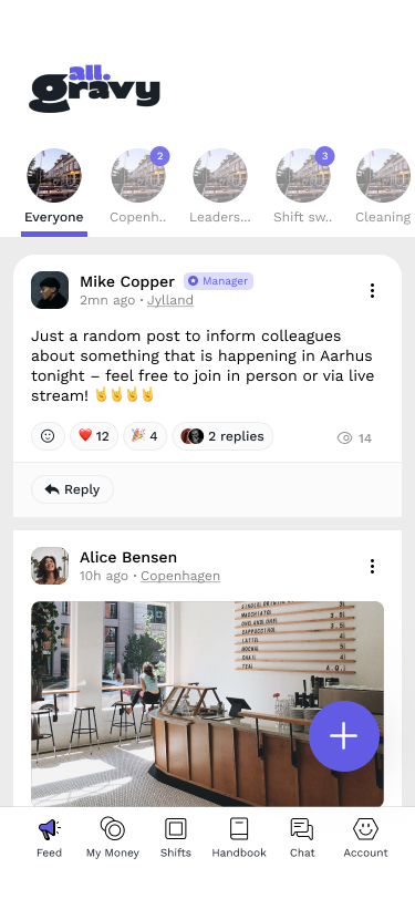 All Gravy lets your employees stay connected with each other, read handbooks, give feedback, and keep track of their shifts and earnings. No more shuffling between multiple apps just to get a shift and learn how to brew a cup of coffee at their new gig. We even let them withdraw their salary as soon as they’ve finished their shift.