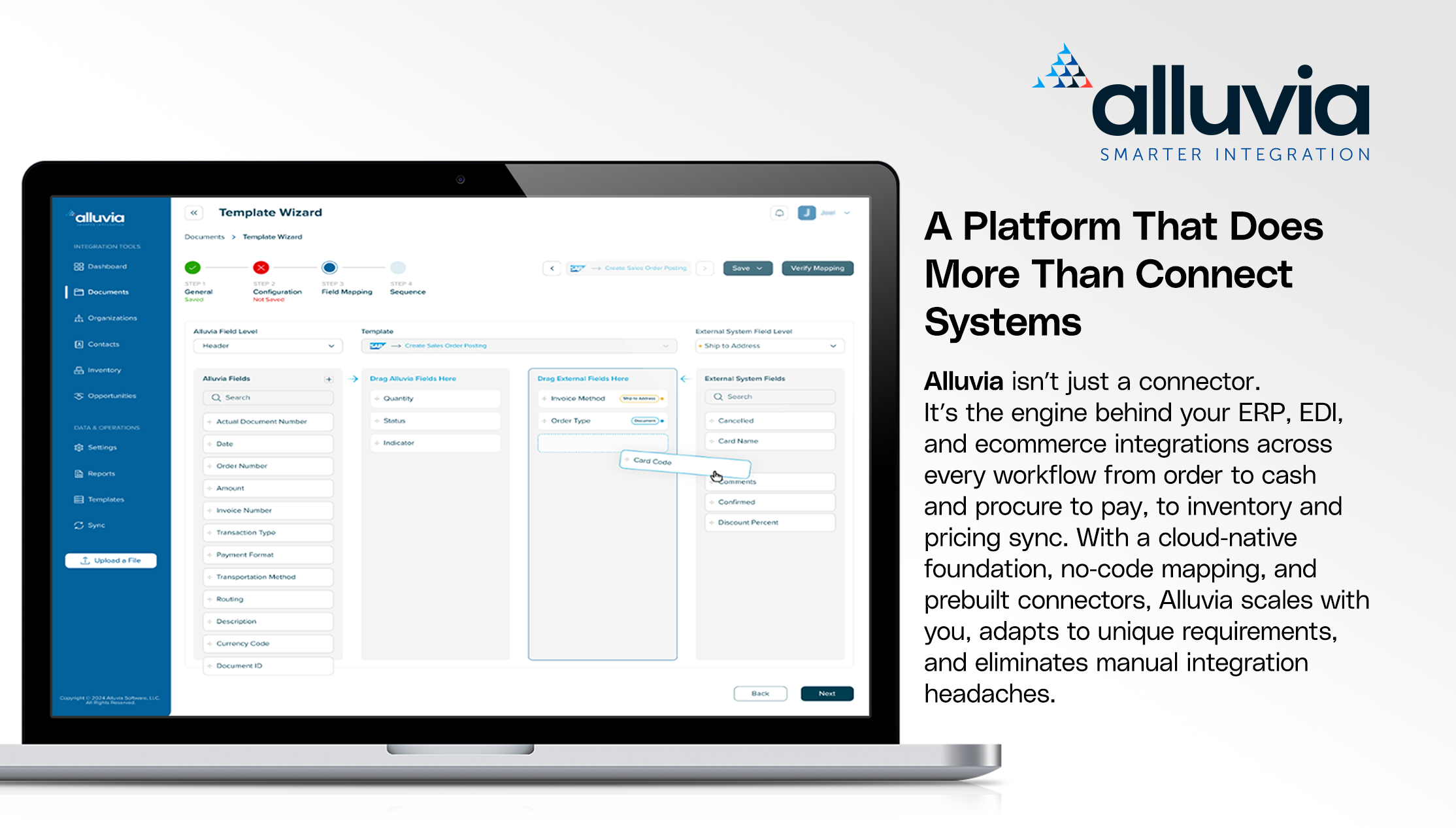 Alluvia is a plug-and-play integration platform that connects ERP, ecommerce, logistics, finance, procurement, CRM, and EDI systems through seamless, automated data flows. With more than 90 prebuilt integrations, a powerful no-code mapping engine, and real-time visibility, Alluvia helps businesses streamline operations, eliminate manual work, and scale integrations effortlessly.