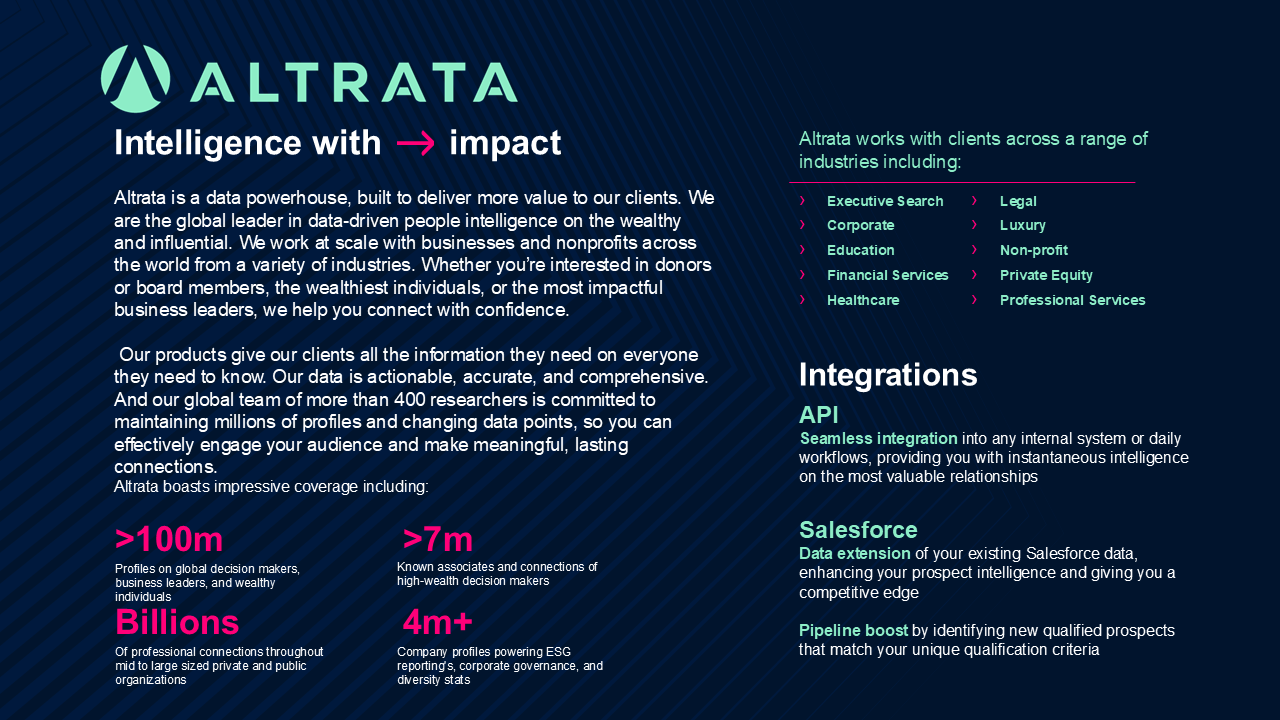 We love using Altrata to get detailed information about our supporters. The dossiers are delivered quickly and are extremely thorough. The platform is easy to navigate which saves us time. Our experience with Jacque was fantastic as well. She has been a great resource for our team and always there to answer any questions we may have. We have had great successes by partnering with Altrata and will surely continue to use them to build our fundraising efforts. Review collected by and hosted on G2.com.