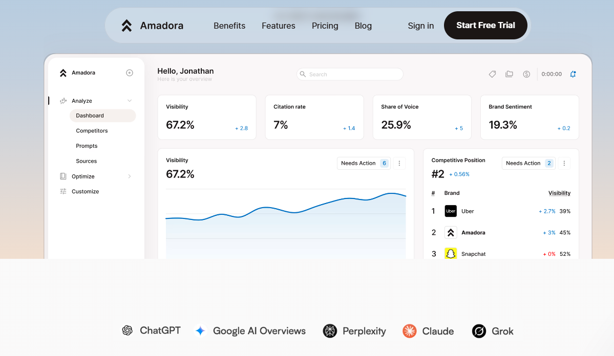 Very clear and informative dashboards that get you right to the insights on prompts, competitors, and metrics (Share of voice is extremely useful).