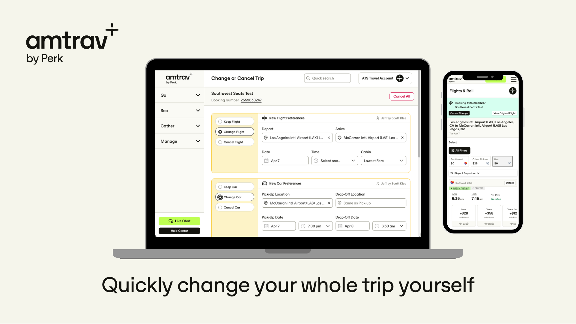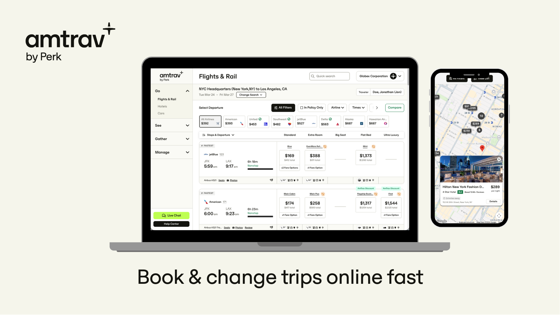 AmTrav's online booking experience is designed to be fast and user-friendly, comparable to popular leisure travel sites, driving high online adoption rates (95% of bookings made online), increased traveler satisfaction, and reduced need for agent assistance.