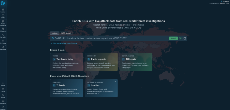 Threat Intelligence Lookup (TI Lookup), a solution for contextual browsing of threat intelligence. It provides access to a vast, continuously updated collection of Indicators of Compromise (IOCs), Indicators of Attack (IOAs), and behavior indicators (IOBs) derived from ANY.RUN’s Interactive Sandbox analyses. With over 40 search parameters, operators, and wildcards, it allows users to perform targeted lookups of threat intel gathered from investigations done by a global network of over 500,000 users and 15,000 organizations. Accompanied by YARA Search, it helps enrich indicators, improve detection rules, and as a result—speed up triage, threat hunting, and incident response.