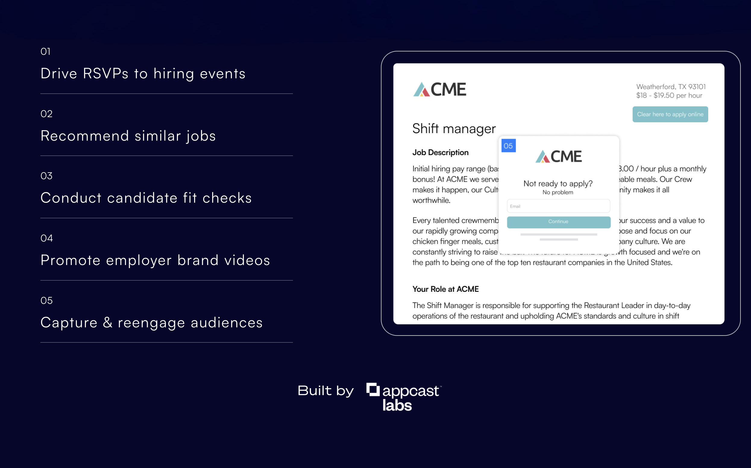 Appcast Xtend captures and remarkets to candidate pools through multi-channel remarketing, converting more visits into applications. Xtend enhances recruitment outcomes across multiple areas, including increased application volume, event participation, employer brand visibility, and alignment bet...
