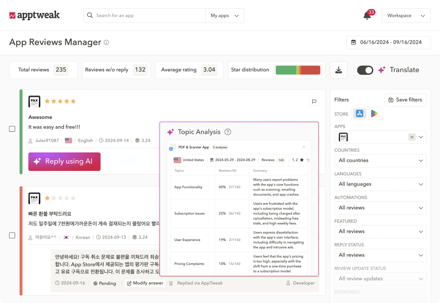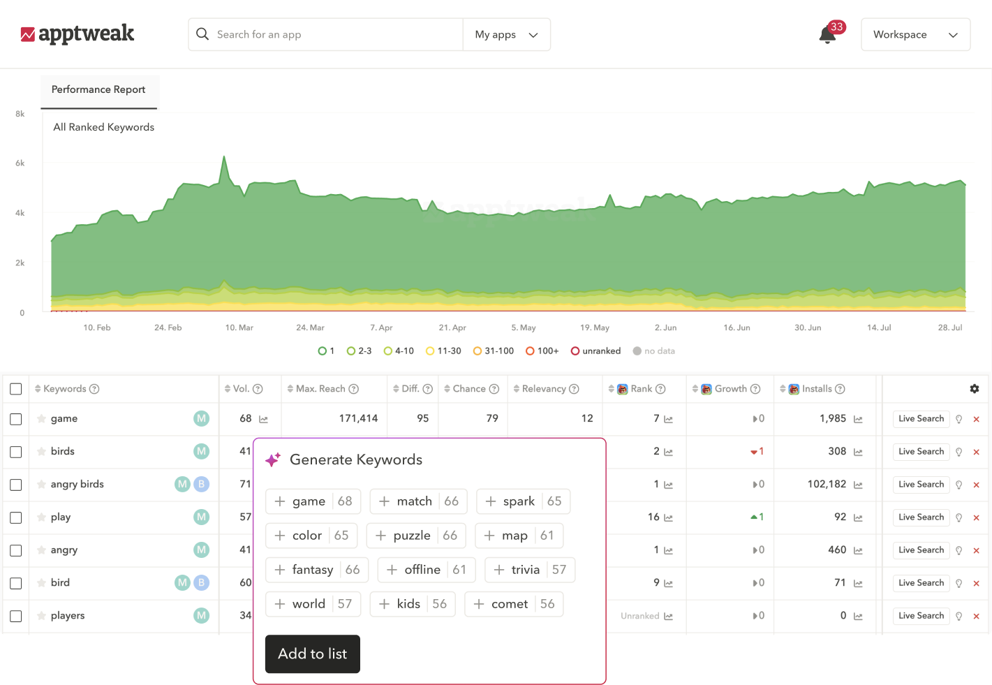 I really like the creative explorer and the keyword tool in AppTweak. The keyword tool's 'all ranked keywords' function works great for optimizing keywords and tracking them. It shows every keyword that we rank for and all the keywords that competitors rank for. The creative explorer tool makes it easy to research what creative assets competitors are using and what they are testing. It shows what A/B tests competitors are running or have run in the past, in every geo, and it's a lot easier than searching the store. The initial setup of AppTweak was very easy. Review collected by and hosted on G2.com.
