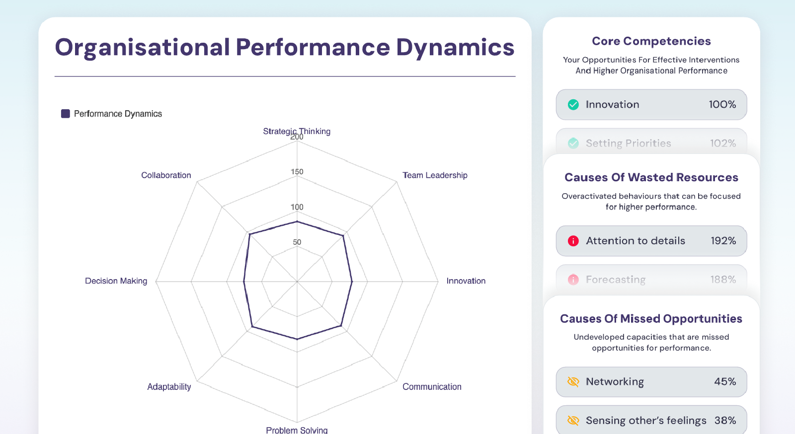 ArcFinder is a performance analytics product designed to help leaders understand why performance varies and what to change to improve it. It uses a structured questionnaire and reporting framework to surface the behaviours, motivations, and working patterns that shape performance across individuals, teams, departments, and organisations. The aim is simple: to make clear what is driving results, what is getting in the way, and what needs to shift to improve performance over time.