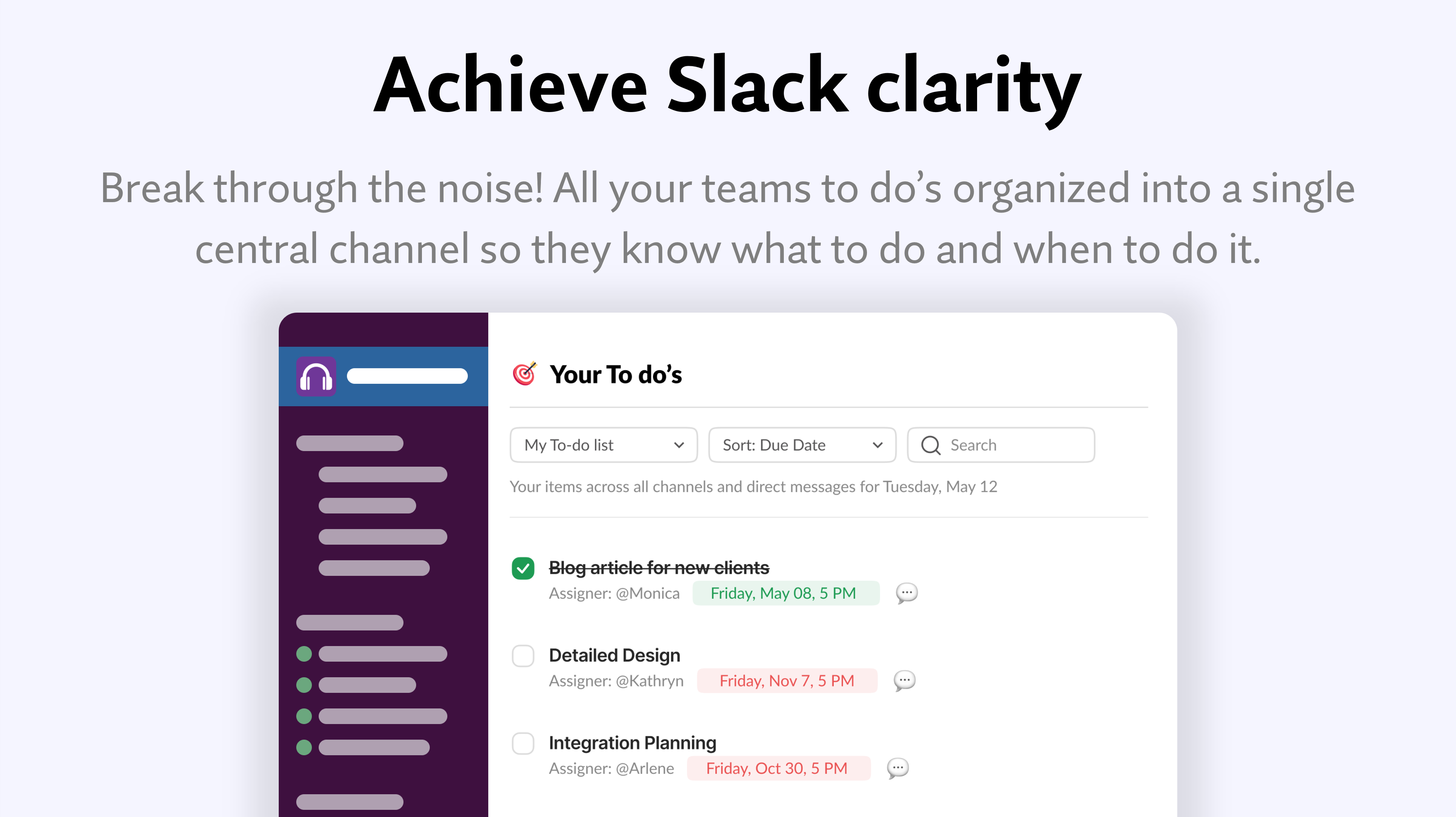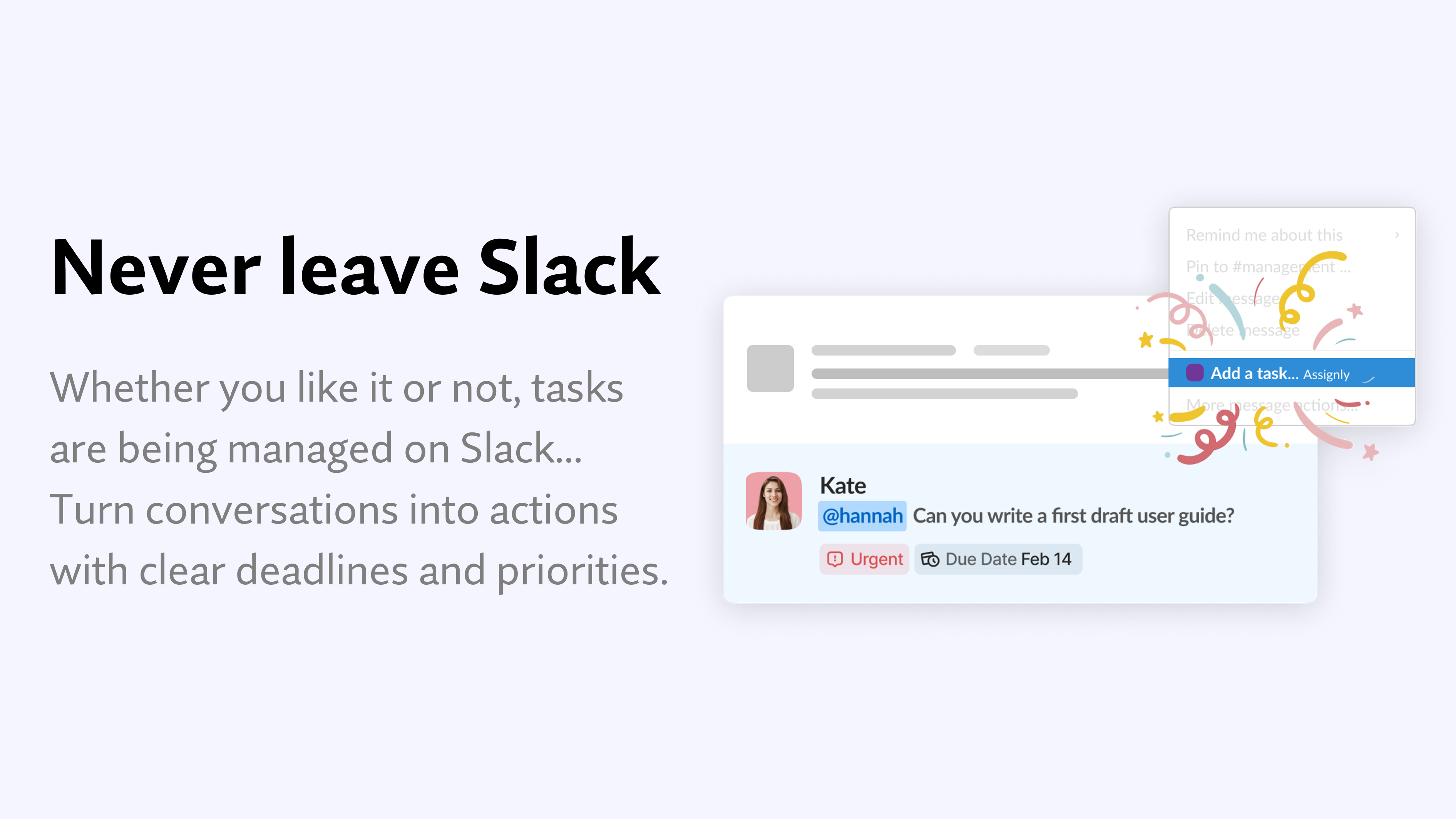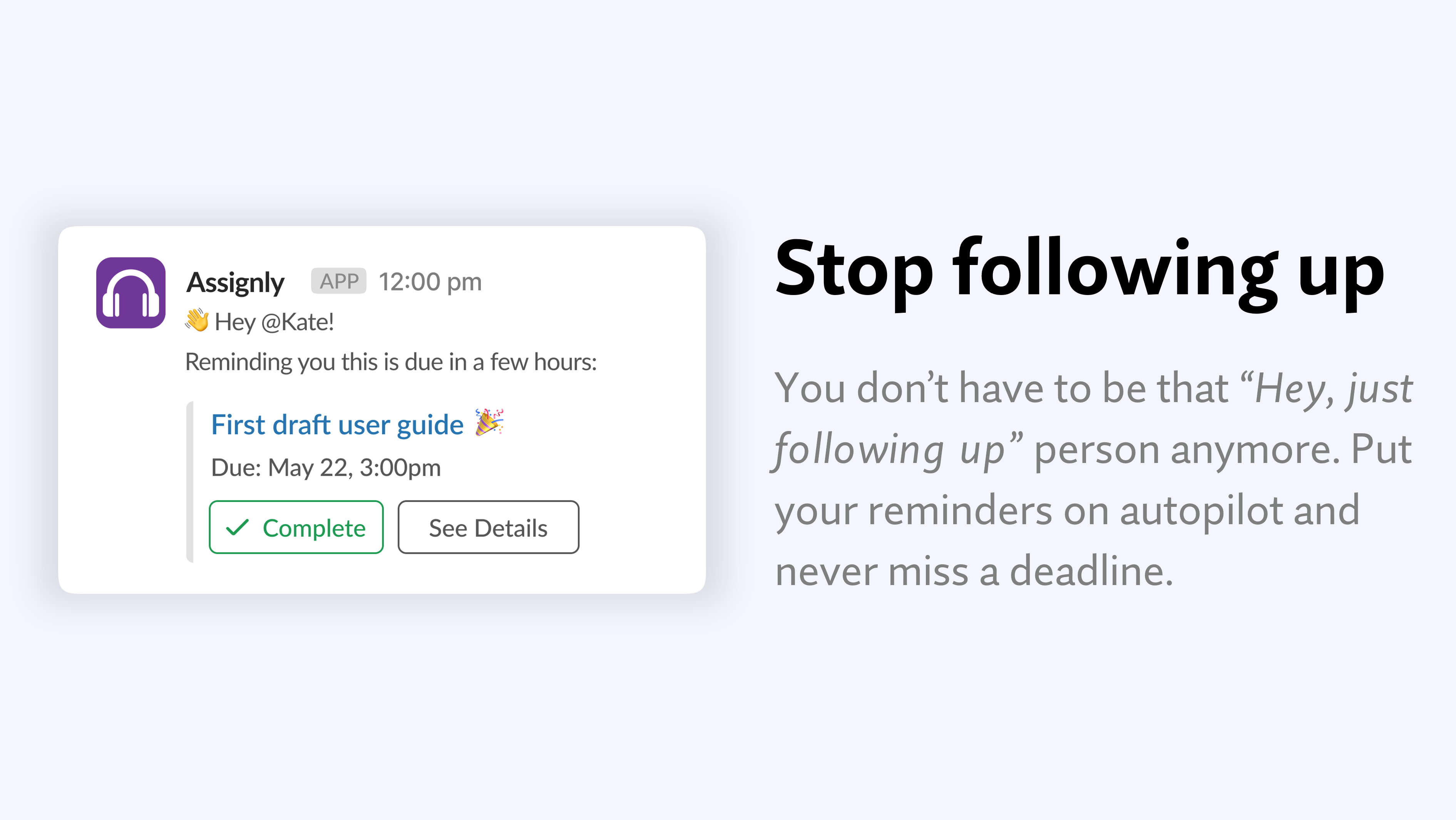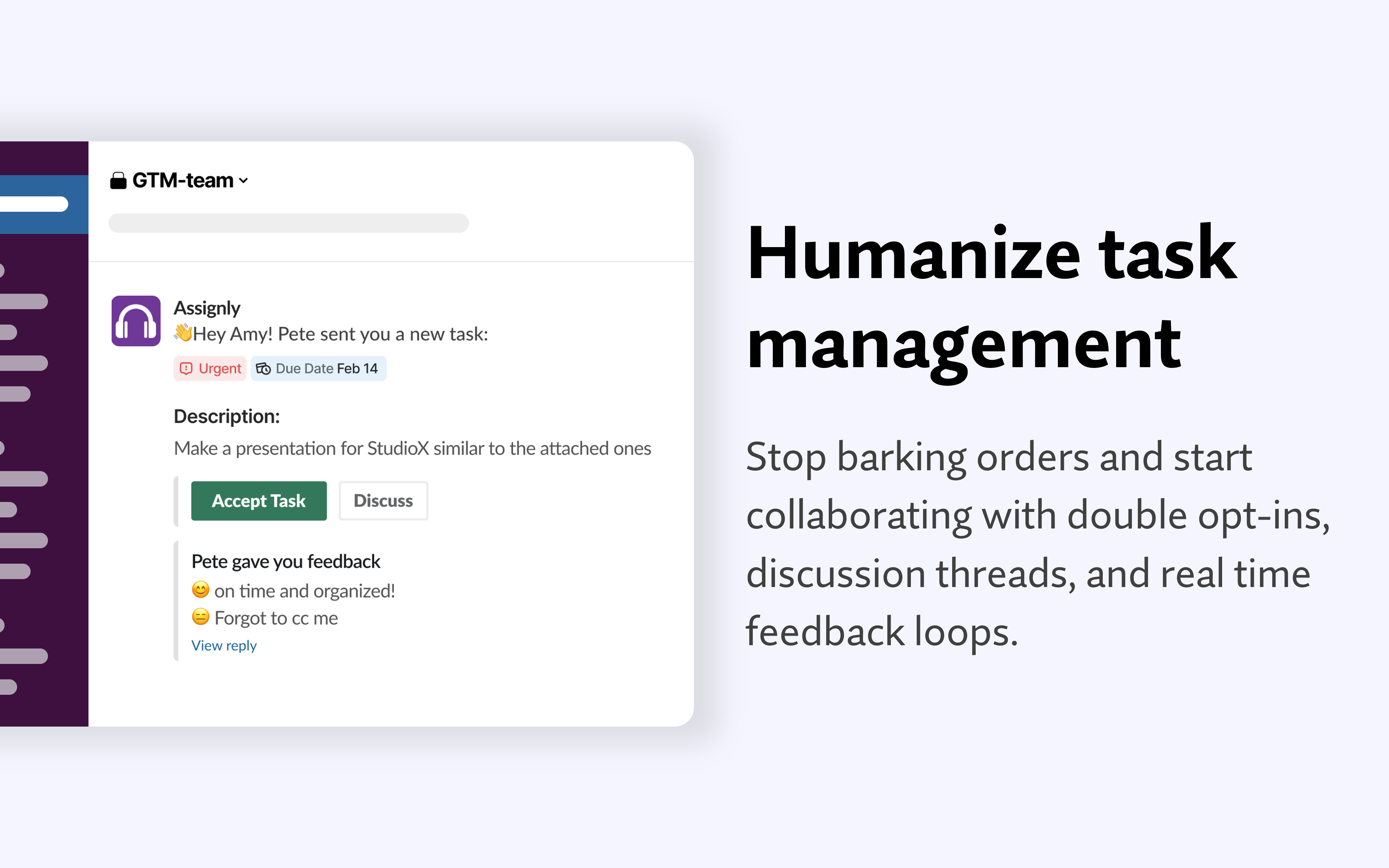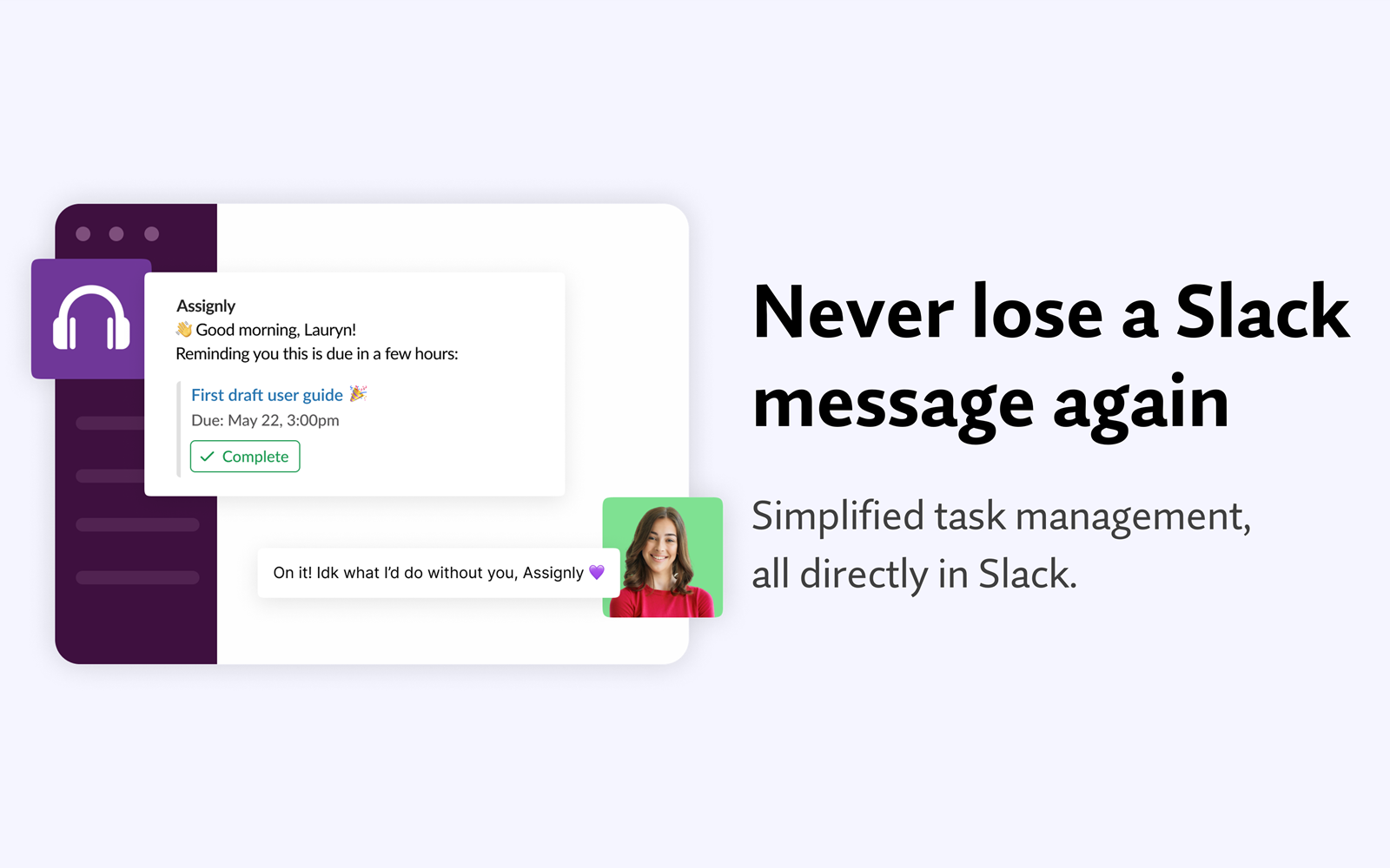 First of all, it's really easy for a Slack message to get "lost in the weeds" so to speak. I love the quick "Convert to Task" (or whatever it's called) message action that lets me keep record of it very easily. I also love how simple the task/question model is, and how it follows up with you near the due date, but doesn't spam you. Also, it's nice to know that I can assign little things to teammates without them getting too deprioritized or also "lost in the weeds". Finally, I like the Assignly DM message app home tab thing; just the other day, I needed to find something I'd been assigned that had been on my mind for a while, and it's really really easy to find the task/question from that view, even if I've already completed it. Review collected by and hosted on G2.com.