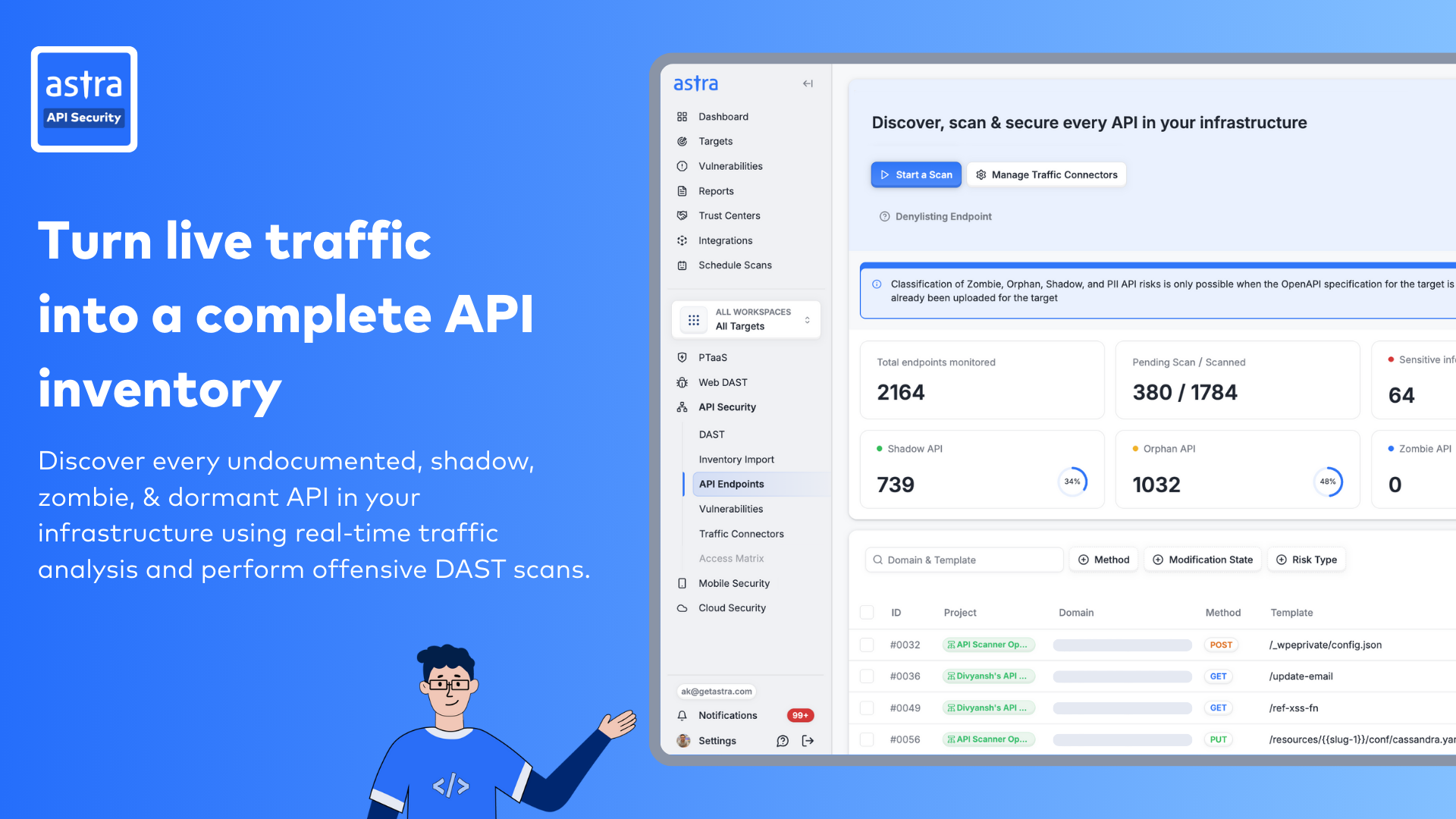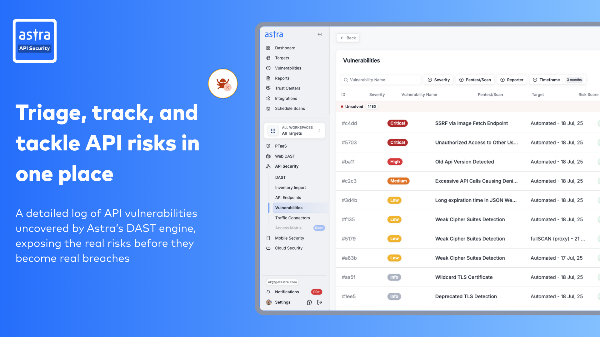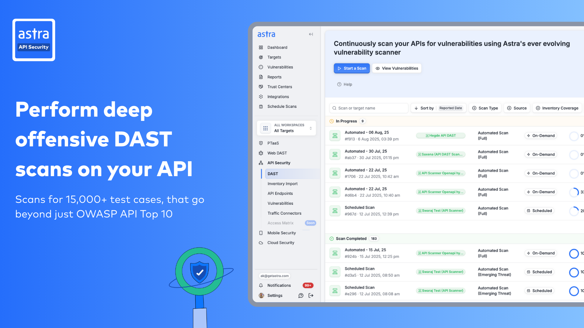 - Comprehensive Coverage: Tests every endpoint and method, addressing all OWASP API Top 10 vulnerabilities, including complex logic issues like BOLA and broken access control.