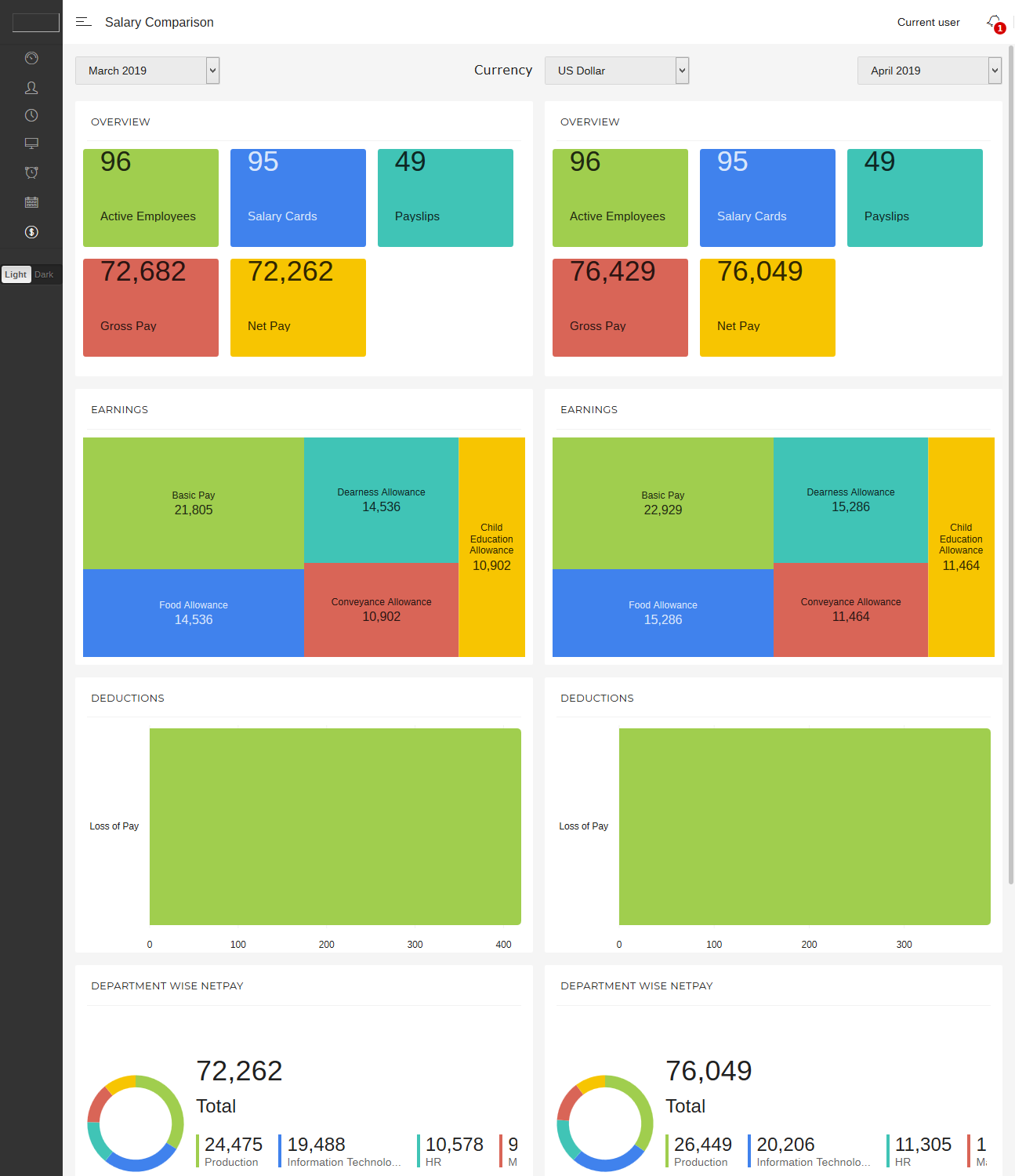 Compare salary with any other salary period to ensure correctness and accuracy. Salary Comparison can be at company, location, department or employee level. As a manager you get instant overview of payroll with the ability to drill down to details to make quick decisions.