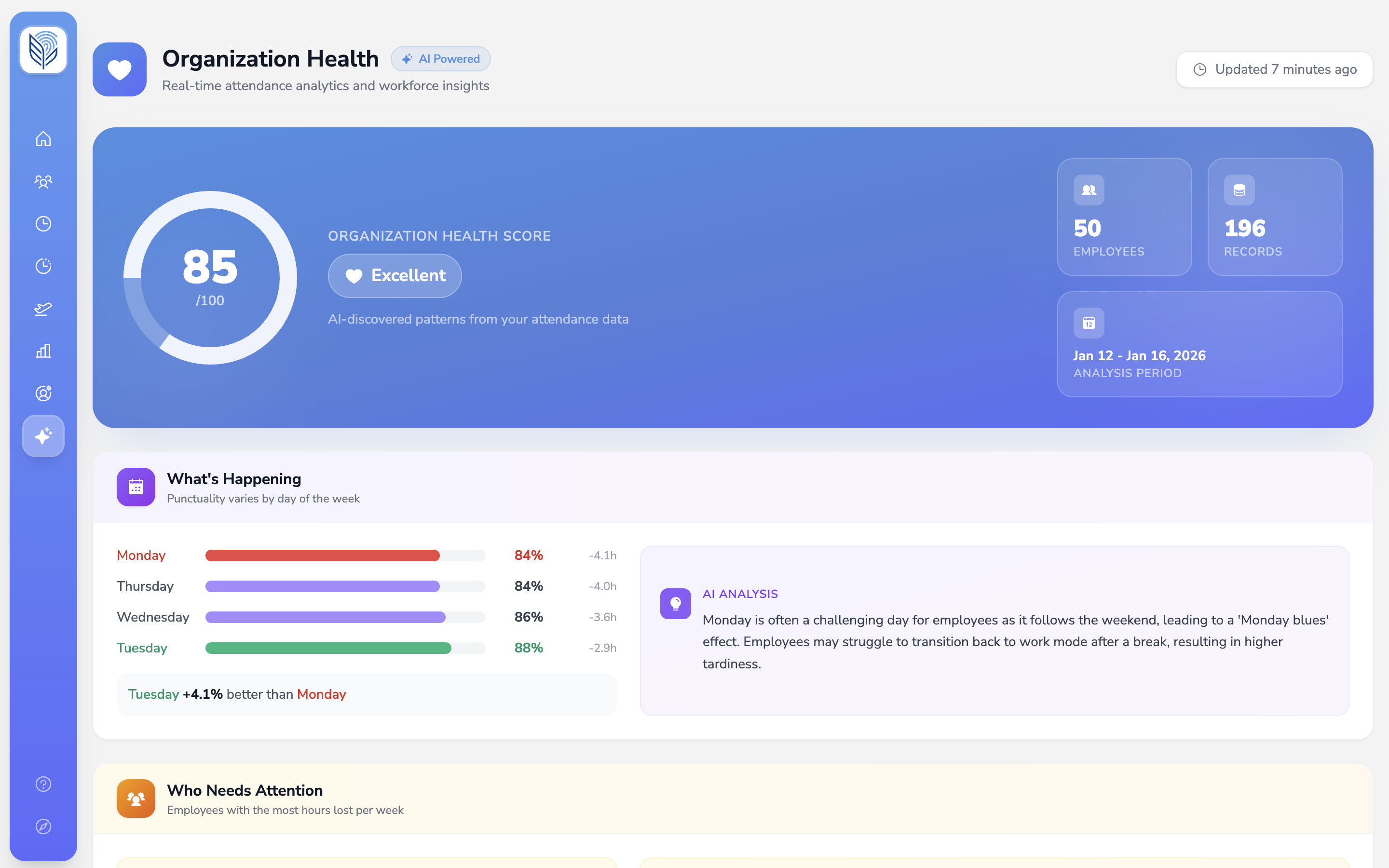 Get an organization health score powered by artificial intelligence. Identify attendance patterns, predict