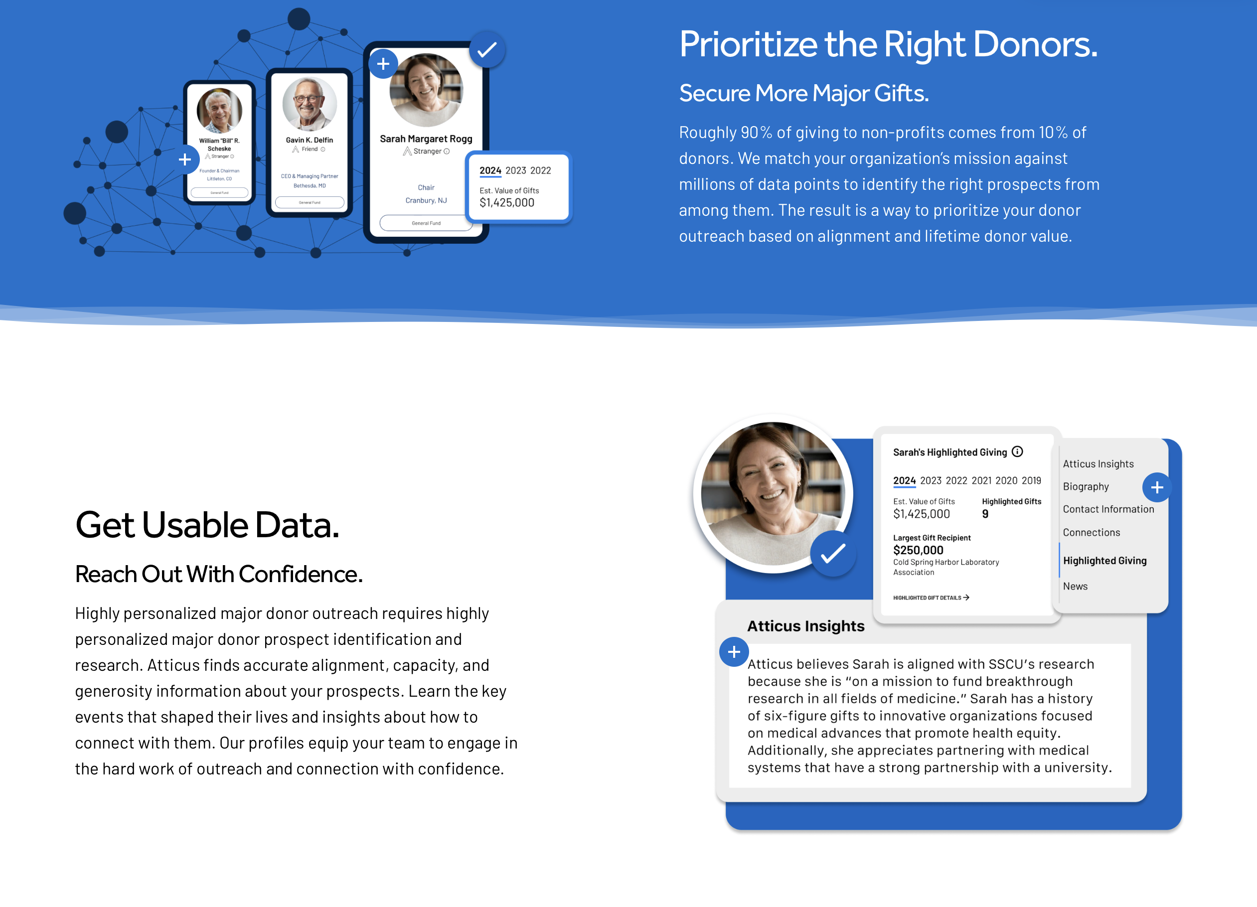 DonorSearch is a donor prospect research, identification and fundraising software tool that utilizes online research, wealth screening and data analytics tools to nonprofits.