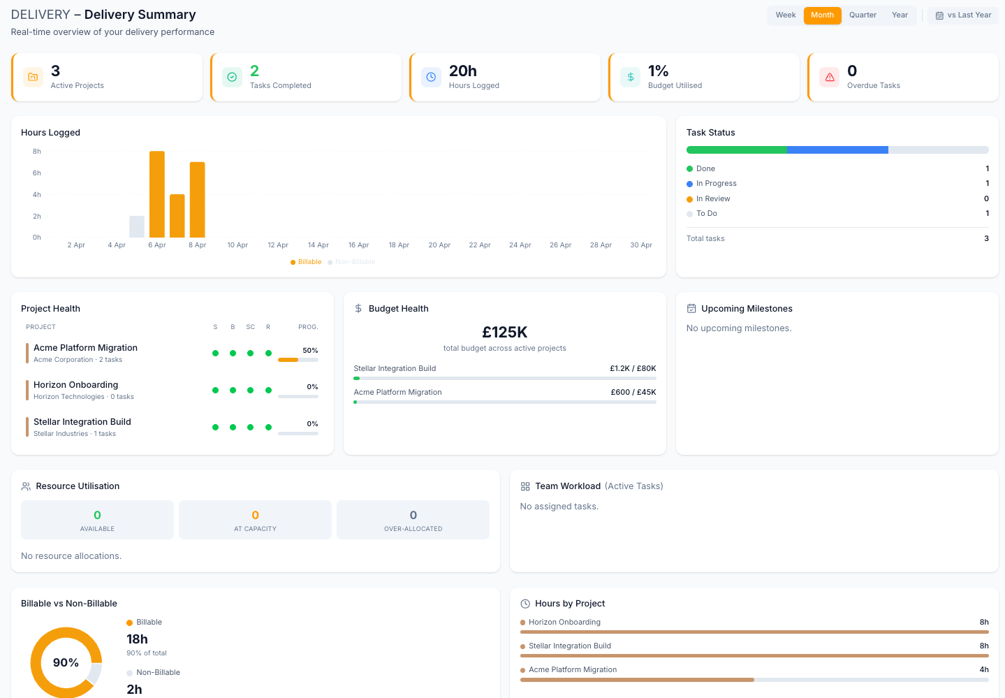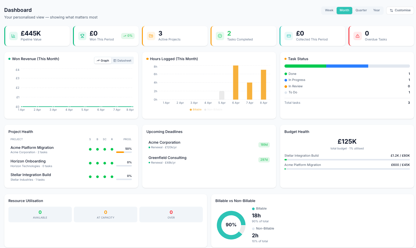 * Project Time & Cost Management: Track billable and non-billable hours, monitor budgets, and link time directly to project profitability and client billing.