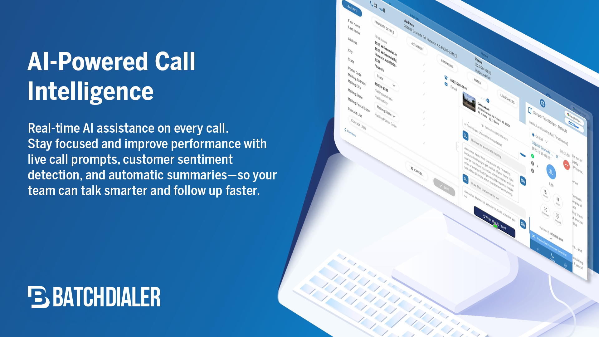 AI-powered Call Intelligence adds a competitive edge with real-time call prompts, automatic summaries, and customer sentiment analysis. It helps reps stay focused, shorten follow-up time, and improve conversations without extra tools or manual logging. BatchDialer also surfaces property details directly in the dialer, offers DNC and litigator scrubbing, and delivers detailed campaign analytics.