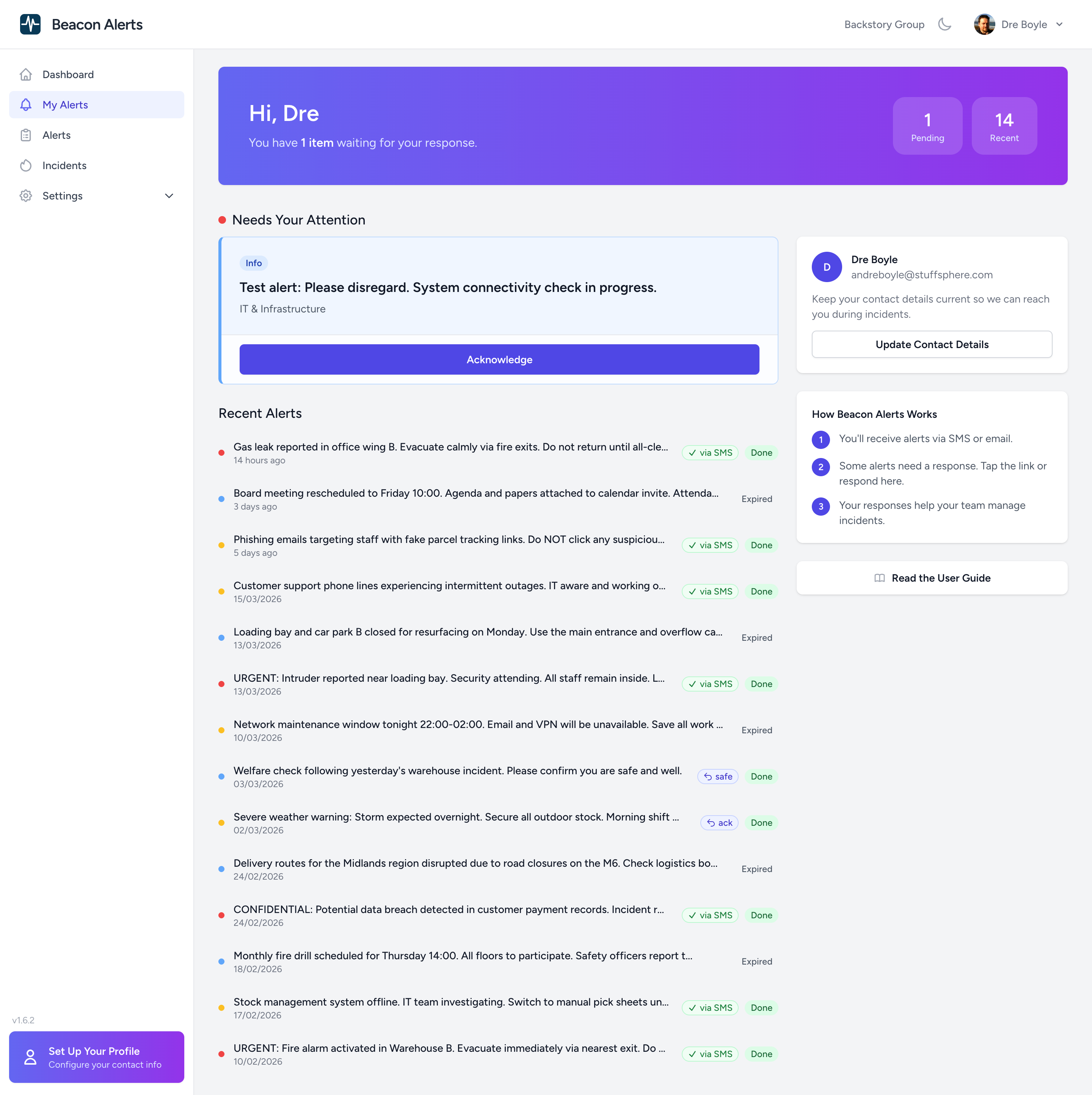 What makes it genuinely different is the privacy architecture. The person sending the alert never sees anyone's personal phone number or email address. Your people manage their own contact details; they add them, they update them, they control them. Beacon delivers the alert on your behalf without exposing that information to anyone. No shared spreadsheets of personal mobiles. No administrator sitting on a pile of contact data they shouldn't have. No GDPR liability you didn't ask for.