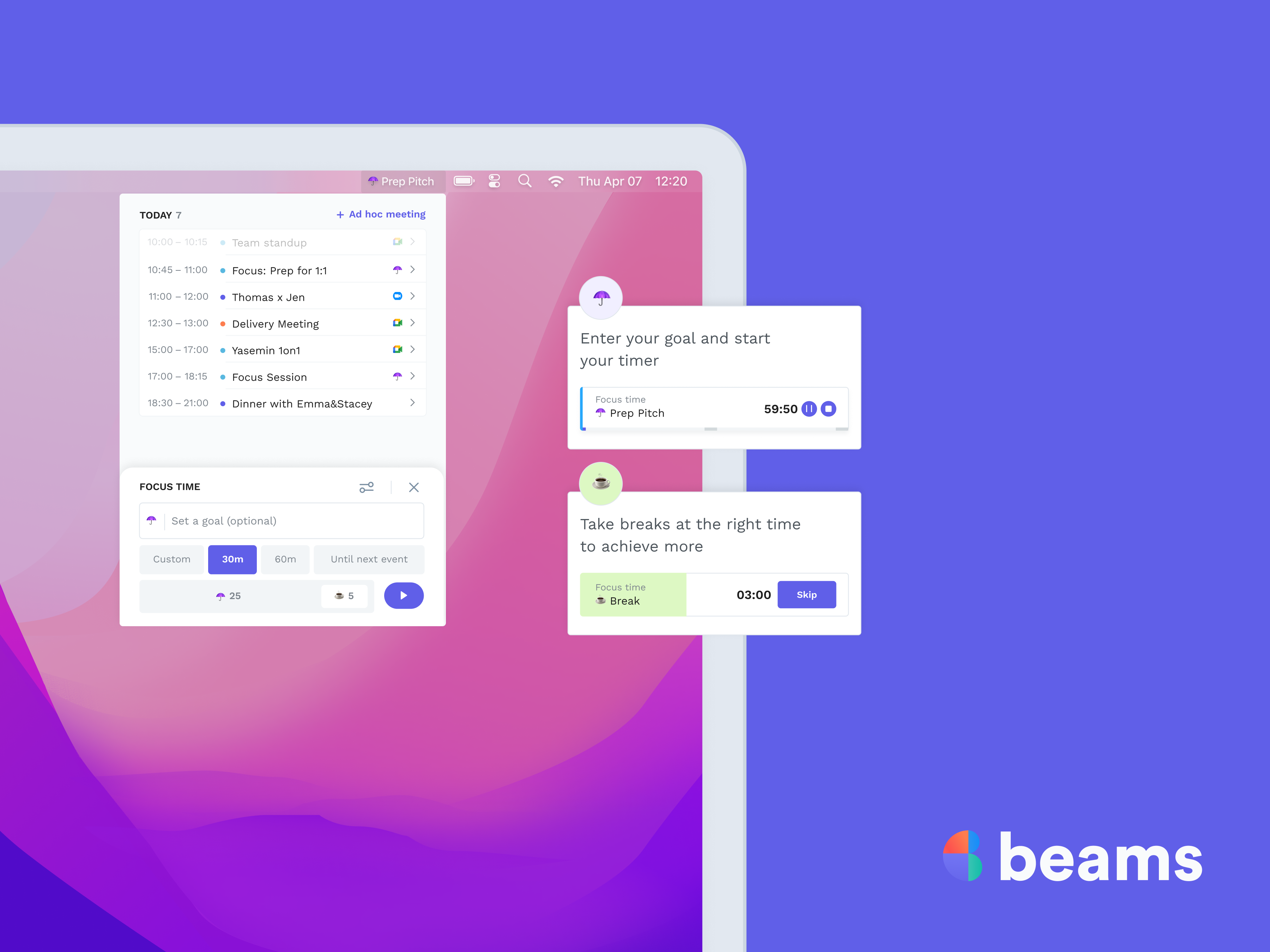 beams guides me through my workday from the menu bar, allowing me to join meetings with one click, silence distracting notifications with Focus Mode, and see my weekly calendar stats to know how I am utilizing my time and whether I need to make improvements to my schedule. Review collected by and hosted on G2.com.