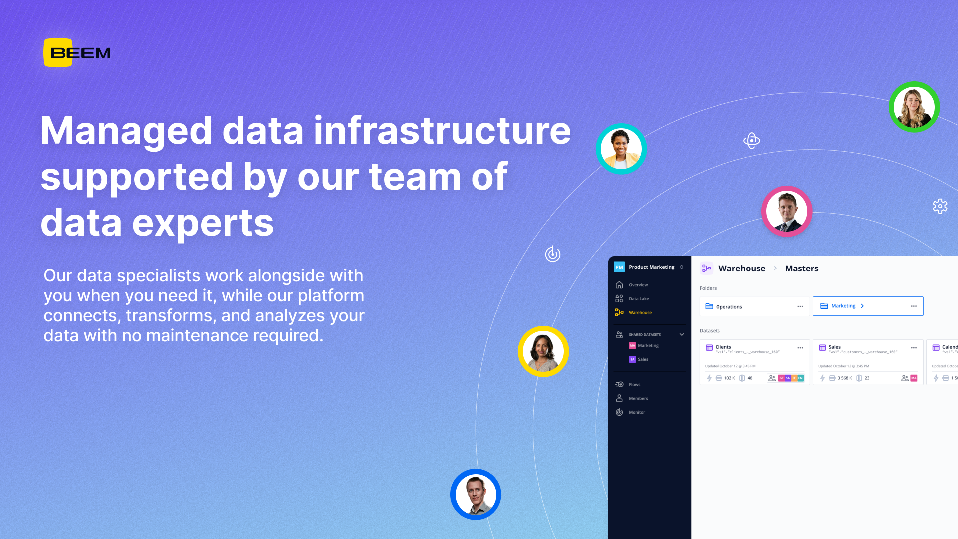 Whether you're a growing company overwhelmed by data silos or an established business looking to modernize without the complexity, BEEM scales with your needs. From startups to enterprises, our platform grows with you while our data experts ensure your success every step of the way.