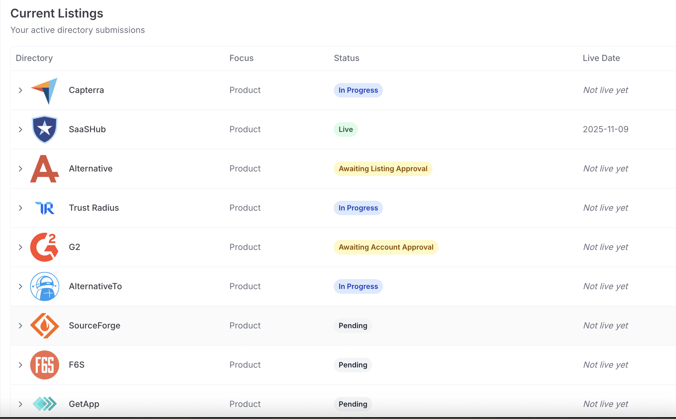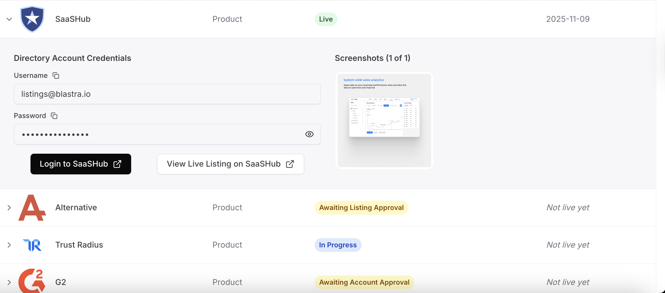 • Centralized dashboard providing complete visibility into submission status, directory accounts, and listing management across all platforms