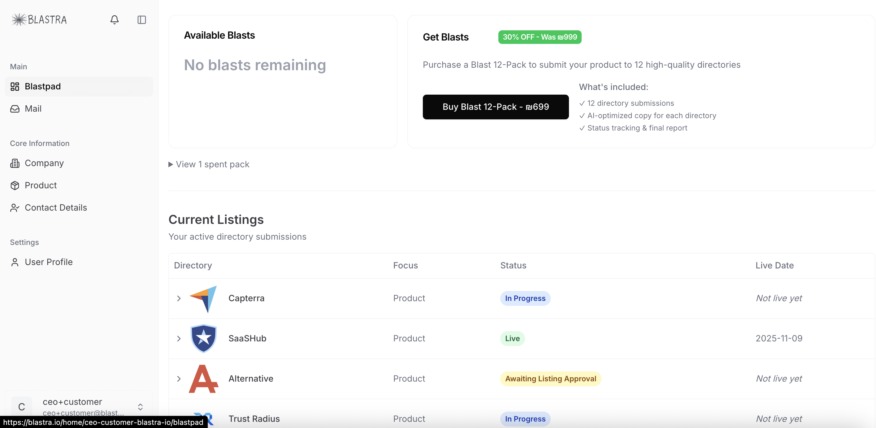 Blastra is a Software Footprint Management platform that helps B2B SaaS companies automate directory submissions and maintain consistent product information across high-profile software directories like G2, Capterra, and SourceForge.