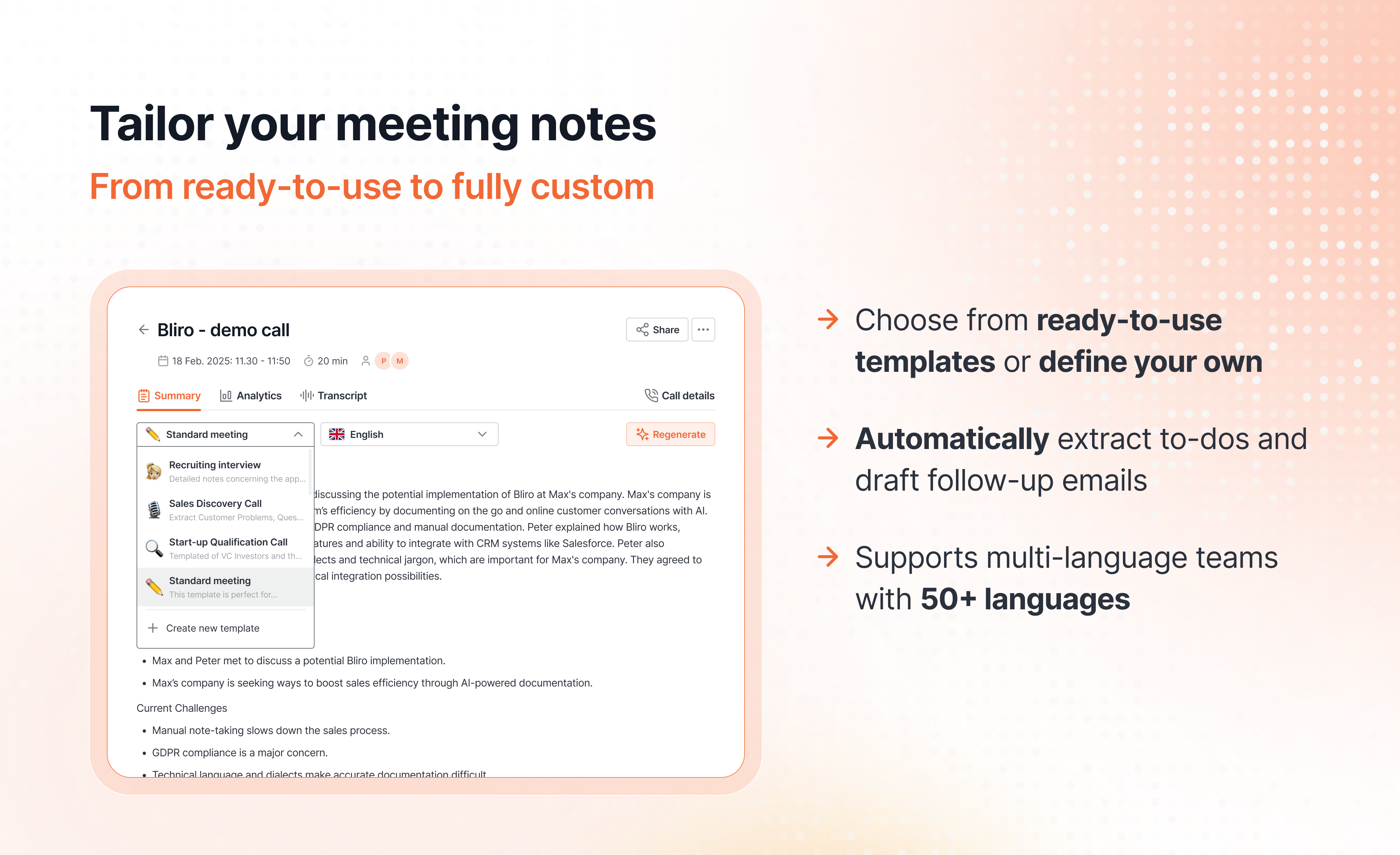 As an outside sales rep, Bliro has completely changed how I handle customer meetings. I can stay fully engaged with clients instead of worrying about taking notes, and still get an accurate transcript and summary afterward. The AI captures key details like next steps and deal insights automatically, which makes preparing follow-ups much faster. For anyone in sales who spends a lot of time in meetings or on the road, Bliro is a real time-saver. Review collected by and hosted on G2.com.
