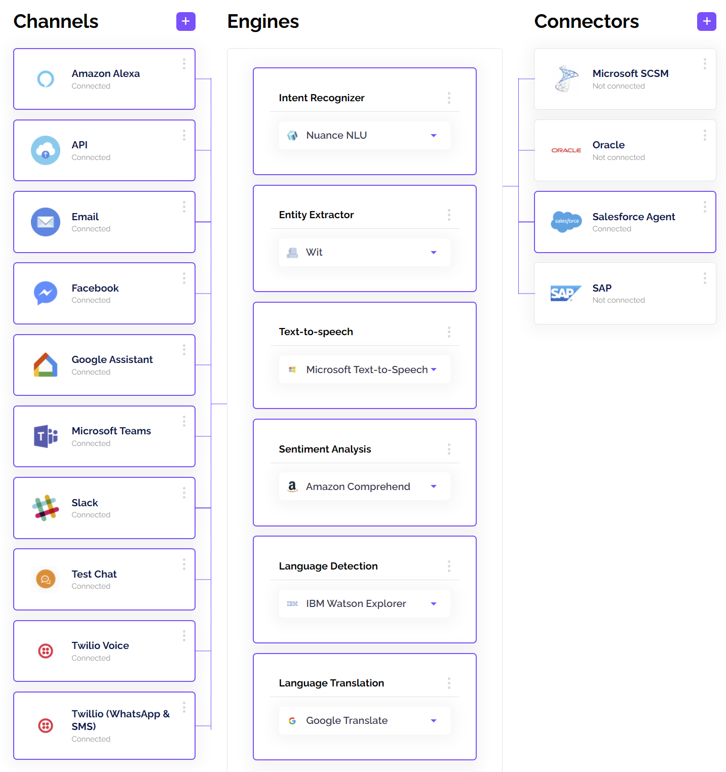 Connect backends to build smart bots (Automation Anywhere, Salesforce, SAP, ServiceNow, UIPath, etc).