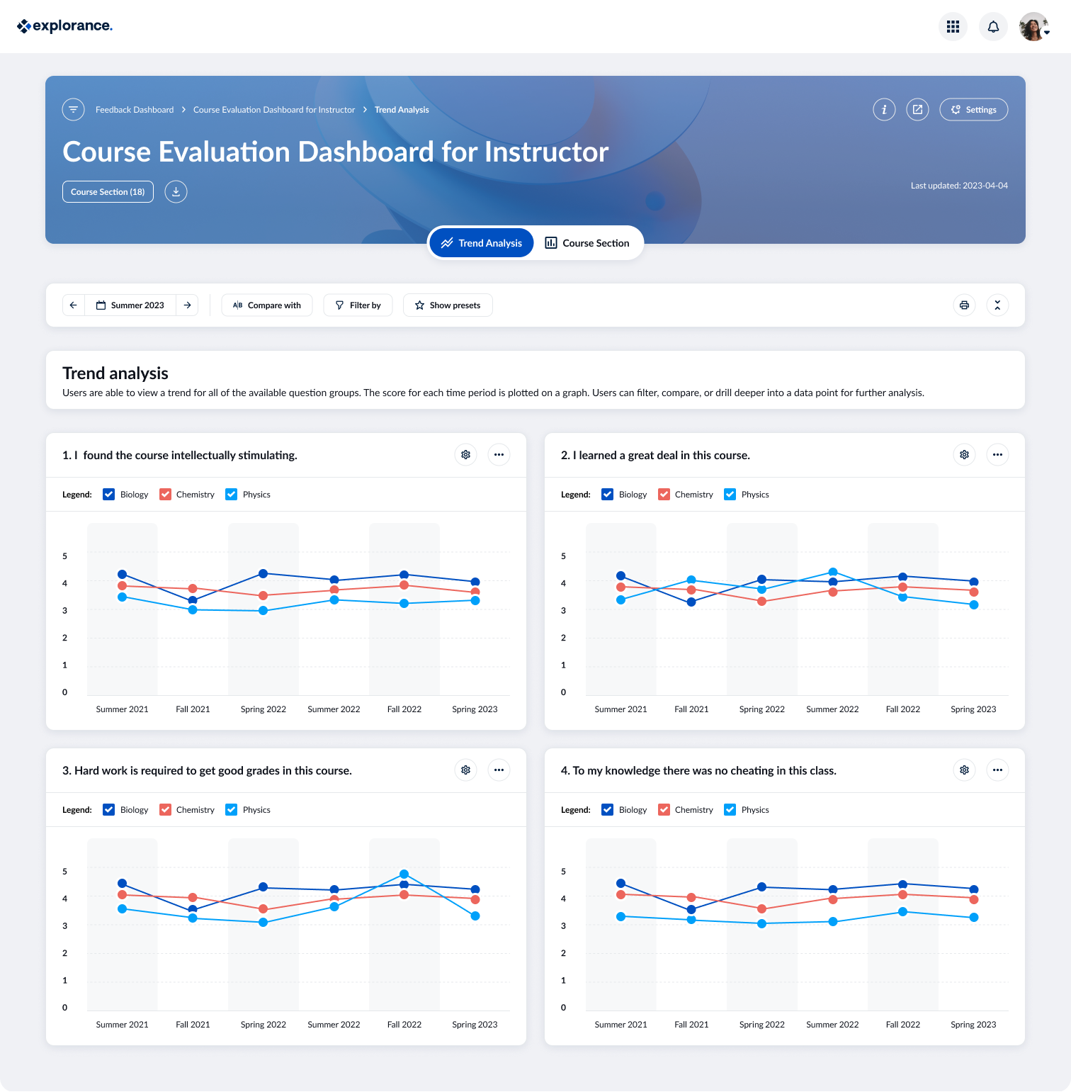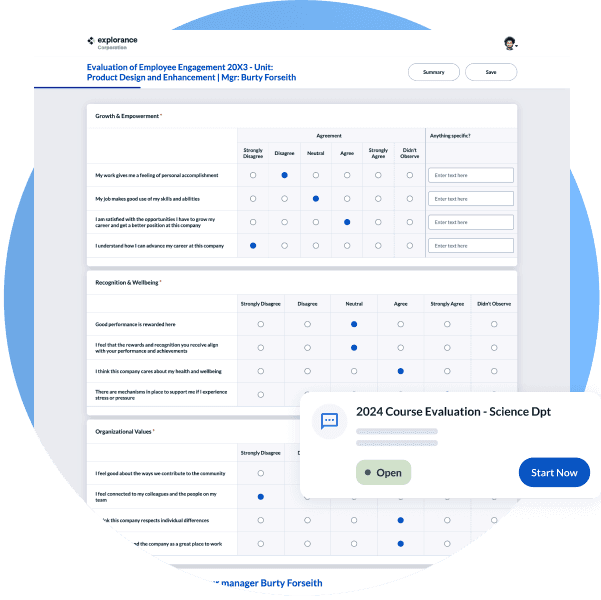 Explorance Blue is a feedback analytics platform that helps institutions and organizations gather, analyze, and act on feedback at scale. From course evaluations and student experience surveys to employee engagement and 360-degree feedback, Blue supports a wide range of feedback use cases. With flexible workflows, deep integration capabilities, and powerful analytics, Blue adapts to your unique structures and systems – whether centralized or decentralized. Automate survey delivery, streamline reporting, and turn feedback into meaningful insights that drive continuous improvement in student and employee experiences.