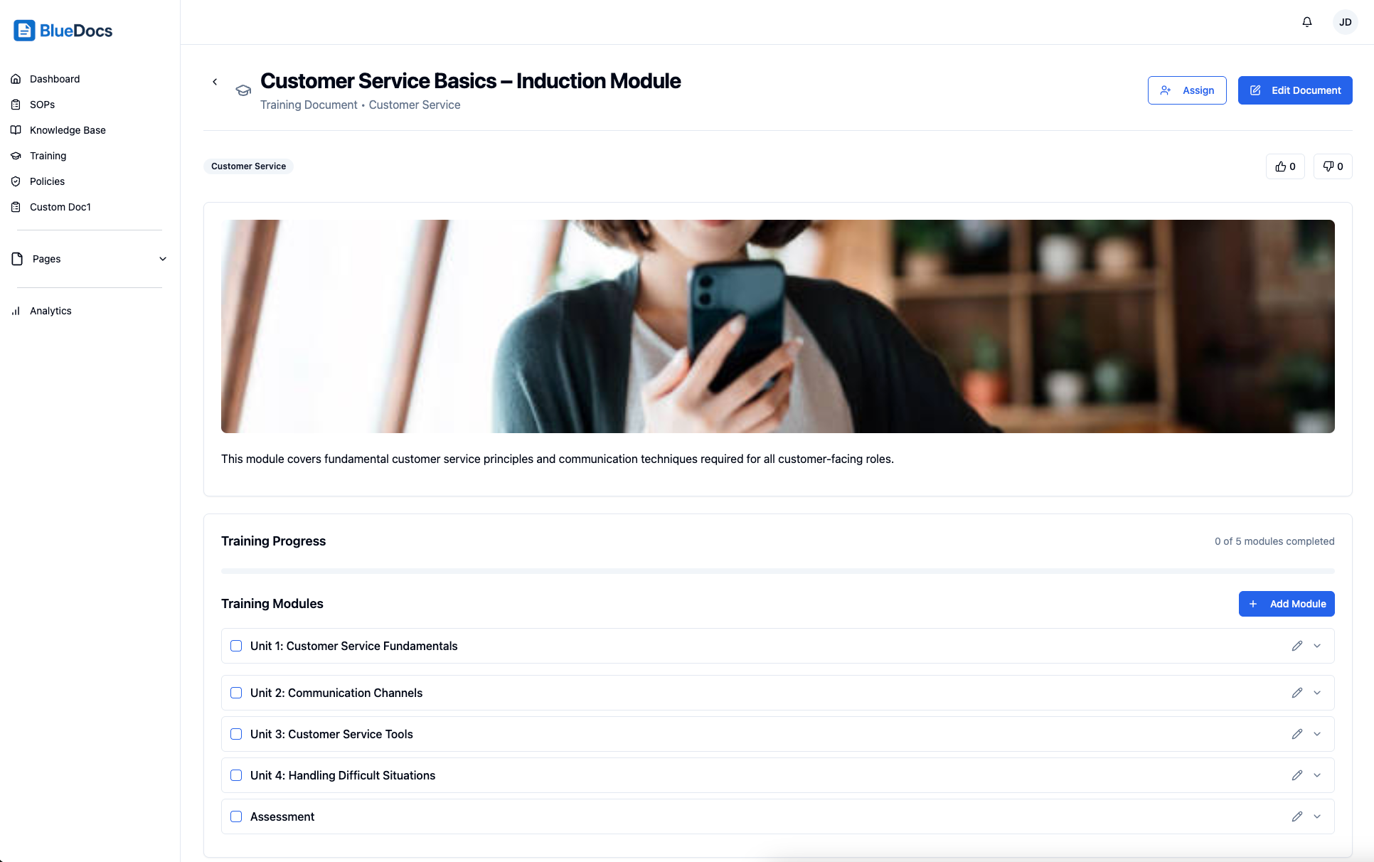 What I like most is that it brought all of our scattered tools into a single system. Before BlueDocs, we had files spread across Google Drive, Dropbox, Confluence, and a separate LMS. It was frustrating trying to track down the latest policy or make sure new hires actually finished their onboarding. With BlueDocs, everything is under one roof: SOPs, policies, training modules, and onboarding checklists. The compliance features are especially useful — acknowledgment tracking and version control make audits painless. The training paths with built-in quizzes have also made it easier to measure employee progress. Plus, the search function is reliable — type in a keyword and the right document almost always comes up.