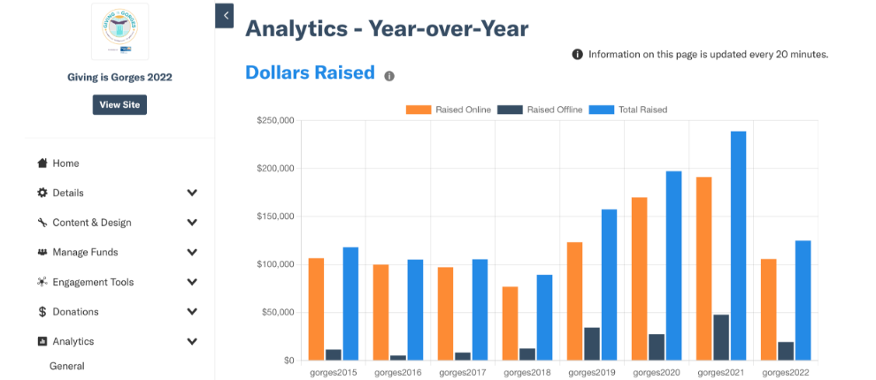 I just wish we were able to download reports of analytics from our giving day. Hopefully one day! Review collected by and hosted on G2.com.