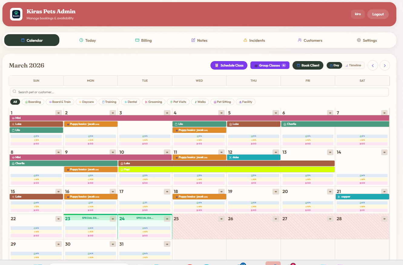 Book'n is all-in-one booking and management software built for pet care businesses. Designed for boarding kennels, dog daycares, groomers, trainers, dog walkers, and pet sitters, Book'n handles online booking, scheduling, client management, payment processing, and daily pet care updates from a single platform.