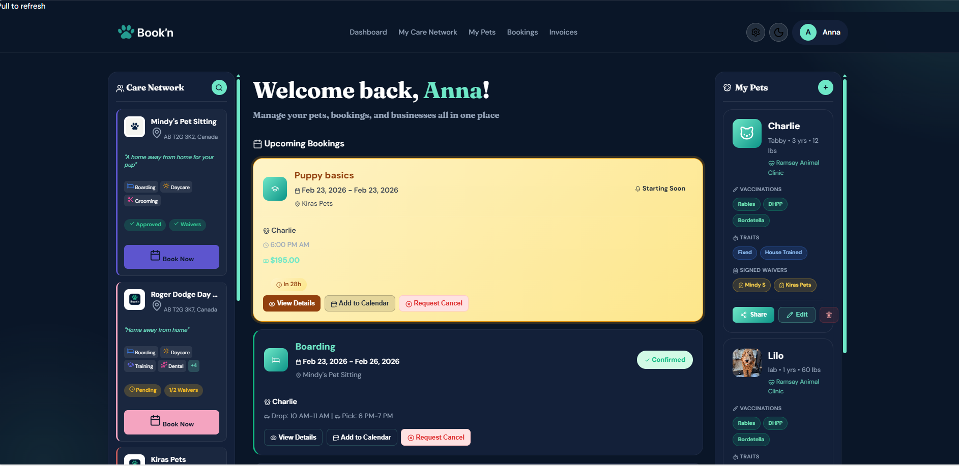 - Pet profiles with vaccination tracking and care notes