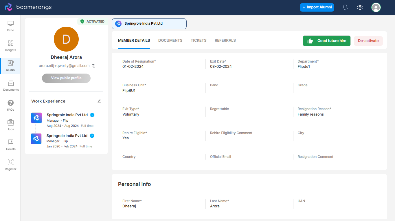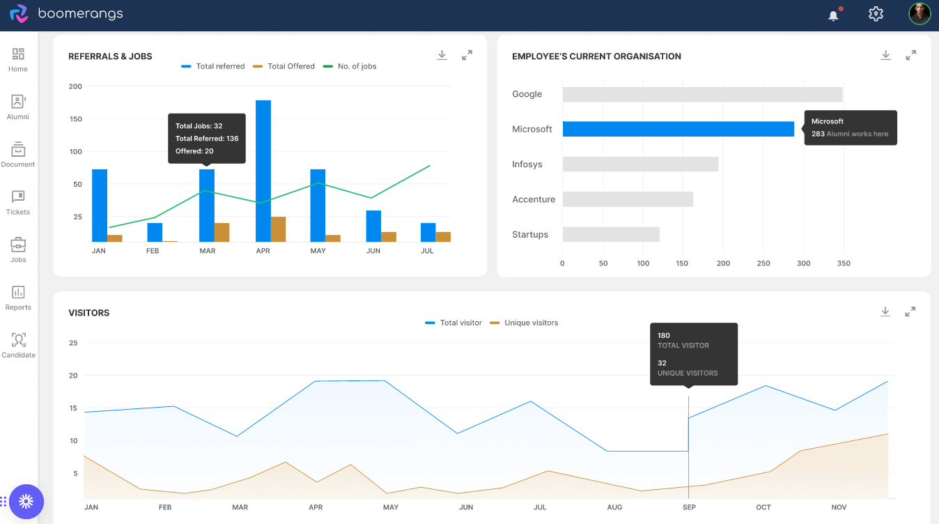 Boomerangs gave us an option of source CVs from the alumni as referrals. It enabled us to make the payouts for the successful referrals via the platform too.