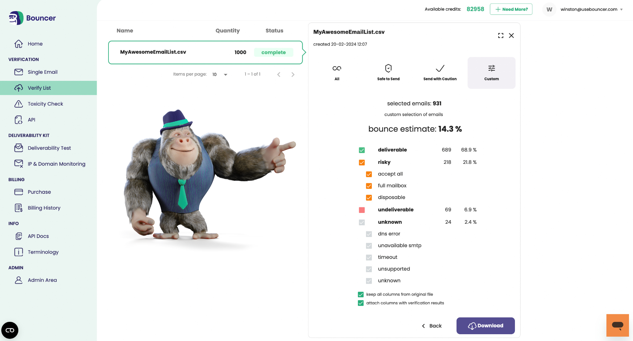 Bouncer allows you to test the quality of your list without actually verifying it – completely free of charge. Based on a randomly selected sample of your list, Bouncer will tell you if your list is fine or if you will need to clean it. This will help you reduce the time and cost of verifying lists that are safe to send.