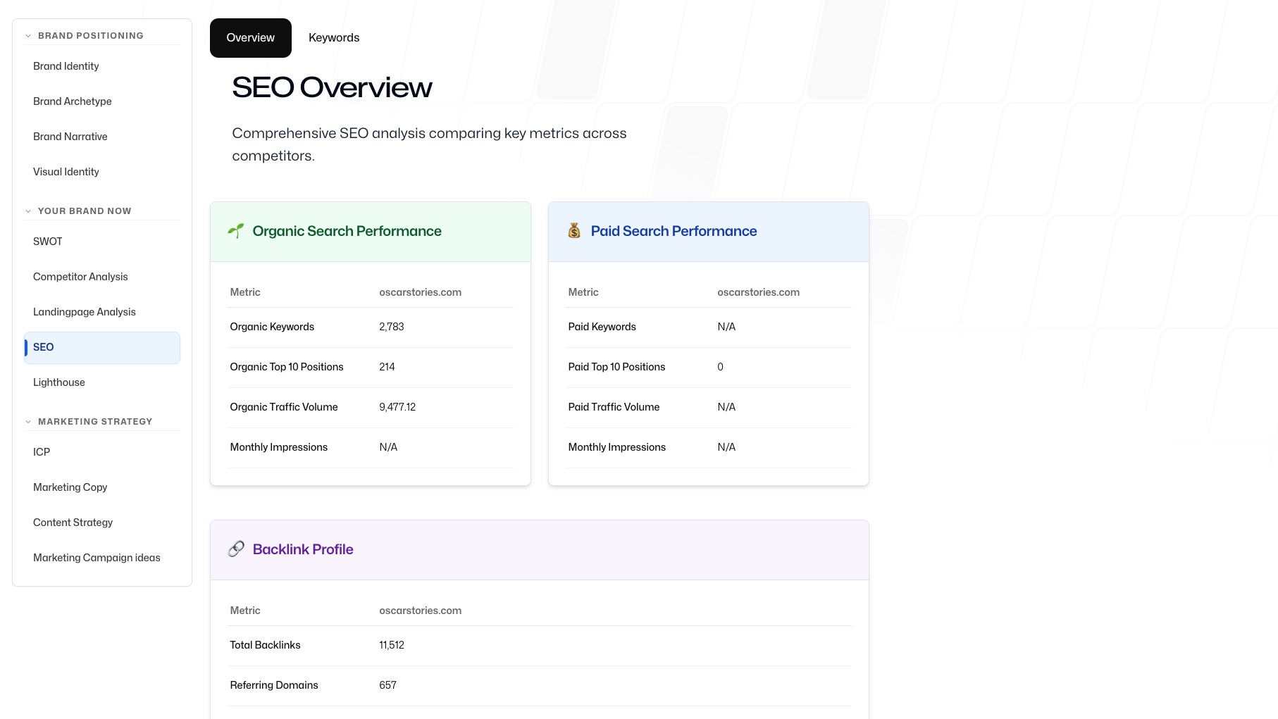 AI-powered brand audits and positioning tools: Automates analysis of competitor positioning, audience insights, and strategic opportunities.