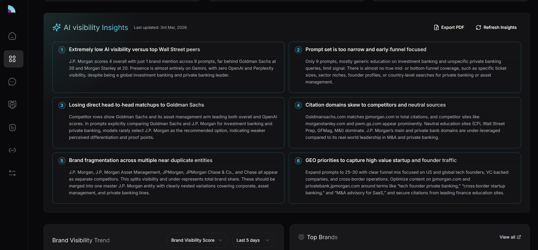 A clear description of how AI platforms interpret your brand: visibility, citations, triggering prompts, sentiment trends, and key insights to guide your GEO strategy.